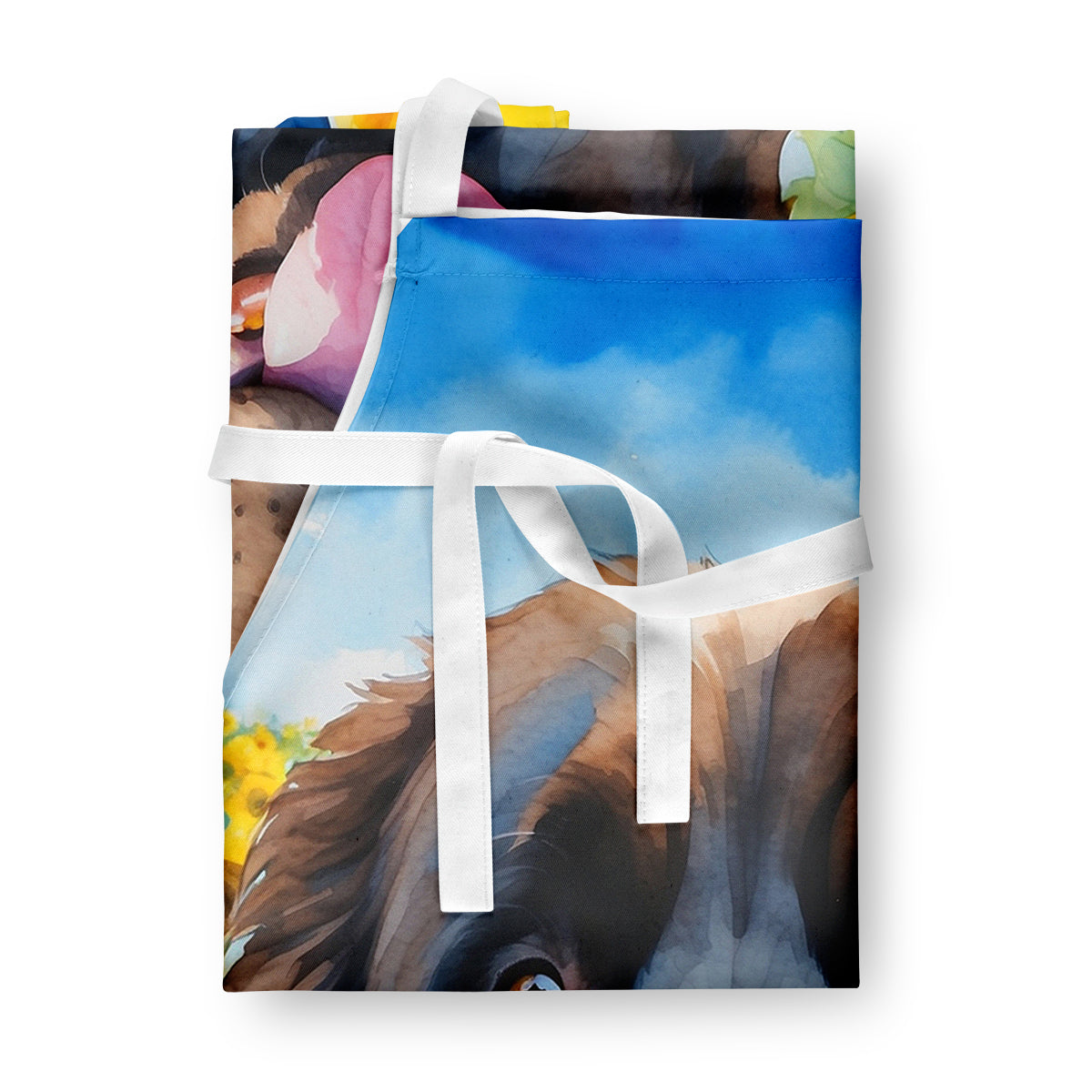 Apron featuring breed specific Newfoundland artwork. Elevate your cooking, baking, and grilling experiences with our versatile Kitchen or BBQ Apron. This Bib Style apron isn't just limited to culinary activities - it also serves as an excellent baking apron, artist apron, server apron, gardening apron, or even a dog grooming apron. The apron showcases vibrant full-color artwork contributed by one of our talented artists, bringing a dash of style to your daily tasks. With dimensions of approximately 27"W x 30"H, it provides ample coverage to protect your clothing from spills and splashes. Our apron is meticulously crafted from 100% Ultra Spun Polyester, known for its durability and lightweight nature. The apron comes with white tie straps, ensuring a comfortable and adjustable fit for all. It's a perfect choice for kitchen apron enthusiasts, whether you are a woman or a man. Designed for easy maintenance, this apron is fully machine washable. The quick-drying polyester material actively reduces staining, keeping your apron looking fresh and new for longer. Our beautifully designed apron isn't just a functional kitchen accessory - it's a fashion statement in the culinary world!
