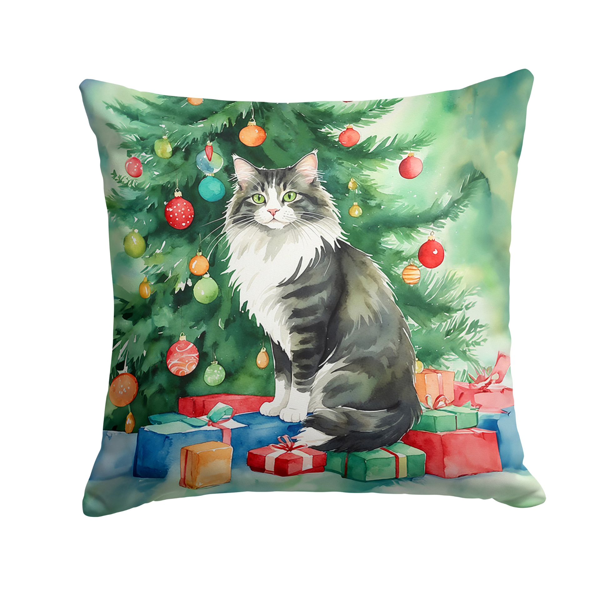 Throw Pillow featuring breed specific Norwegian Forest Cat artwork. Celebrate Christmas with this Christmas Pillow. Revitalize your outdoor or indoor living space with Caroline's Treasures 18x18 Fabric Decorative Pillow. With a generously sized dimension of approximately 18 inches by 18 inches, this pillow makes a comfortable and aesthetic addition to any seating area. Made from a unique, water-resistant material developed by Caroline's Treasures, the pillow sham is 100% polyester fabric that's durable and ready to weather any condition. Its vibrant, full-color artwork will not fade over time as it is dyed with color-fast dyes. Whether you place it on your patio furniture, porch, veranda, or indoor couch, its soft canvas fabric ensures a cozy experience. The pillow is handcrafted in the United States, featuring a sham created from three pieces of fabric and a polyester insert for enduring shape and overstuffed comfort. Despite being robustly built to endure the outdoors, it is as soft and snug as your favorite indoor cushions. Please note, as all our pillows are handmade, sizes may vary slightly, adding to the charm of this unique decorative item.