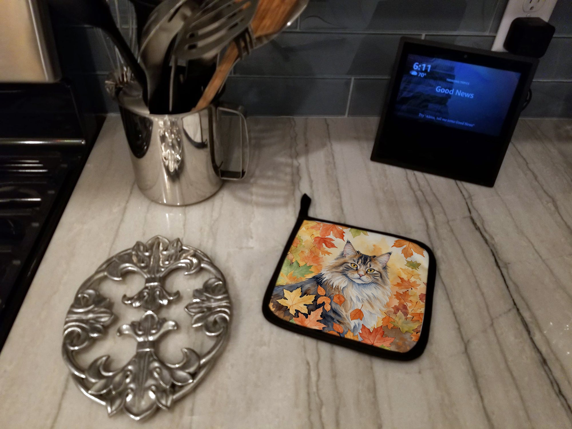 Norwegian Forest Cat in Fall Leaves Pair of Pot Holders