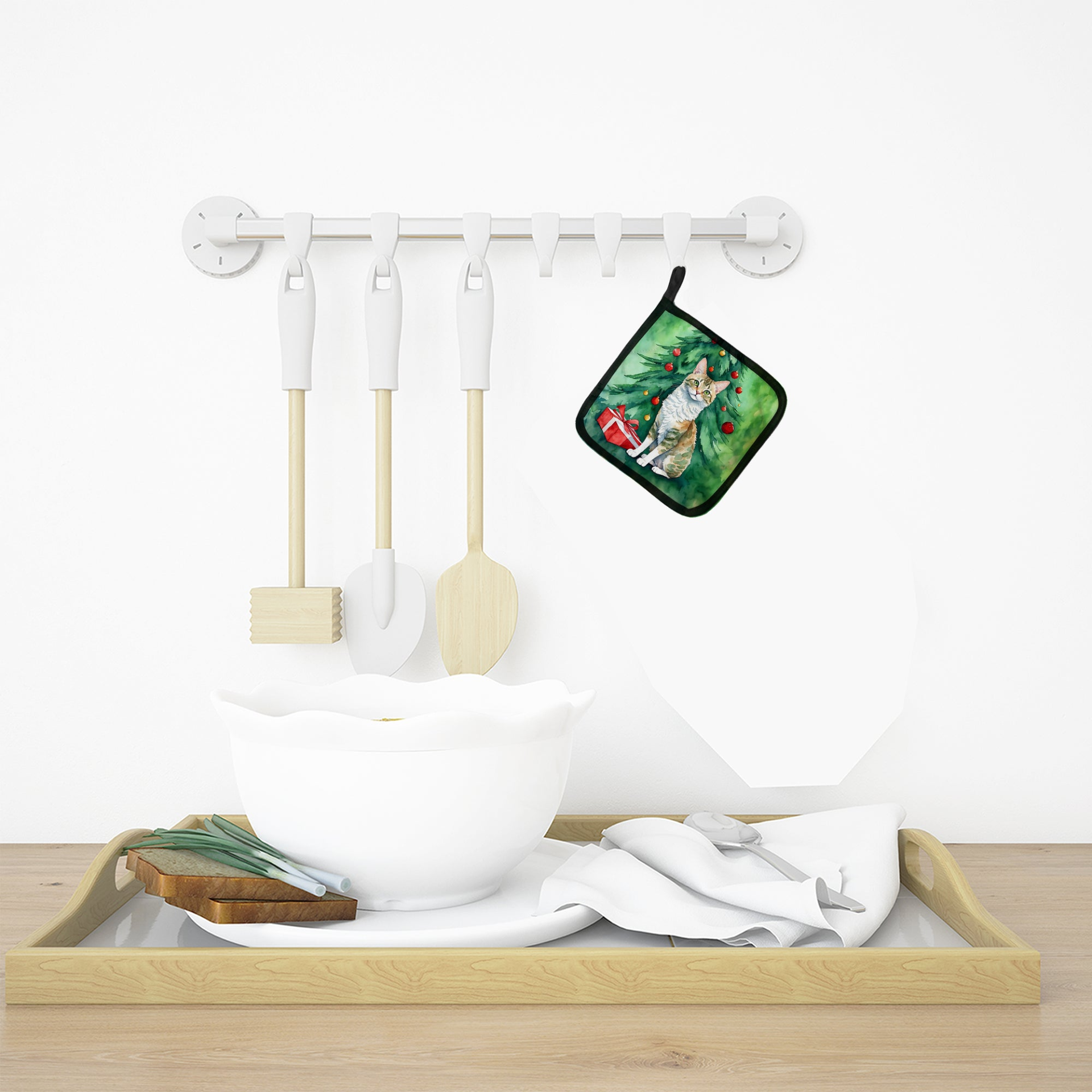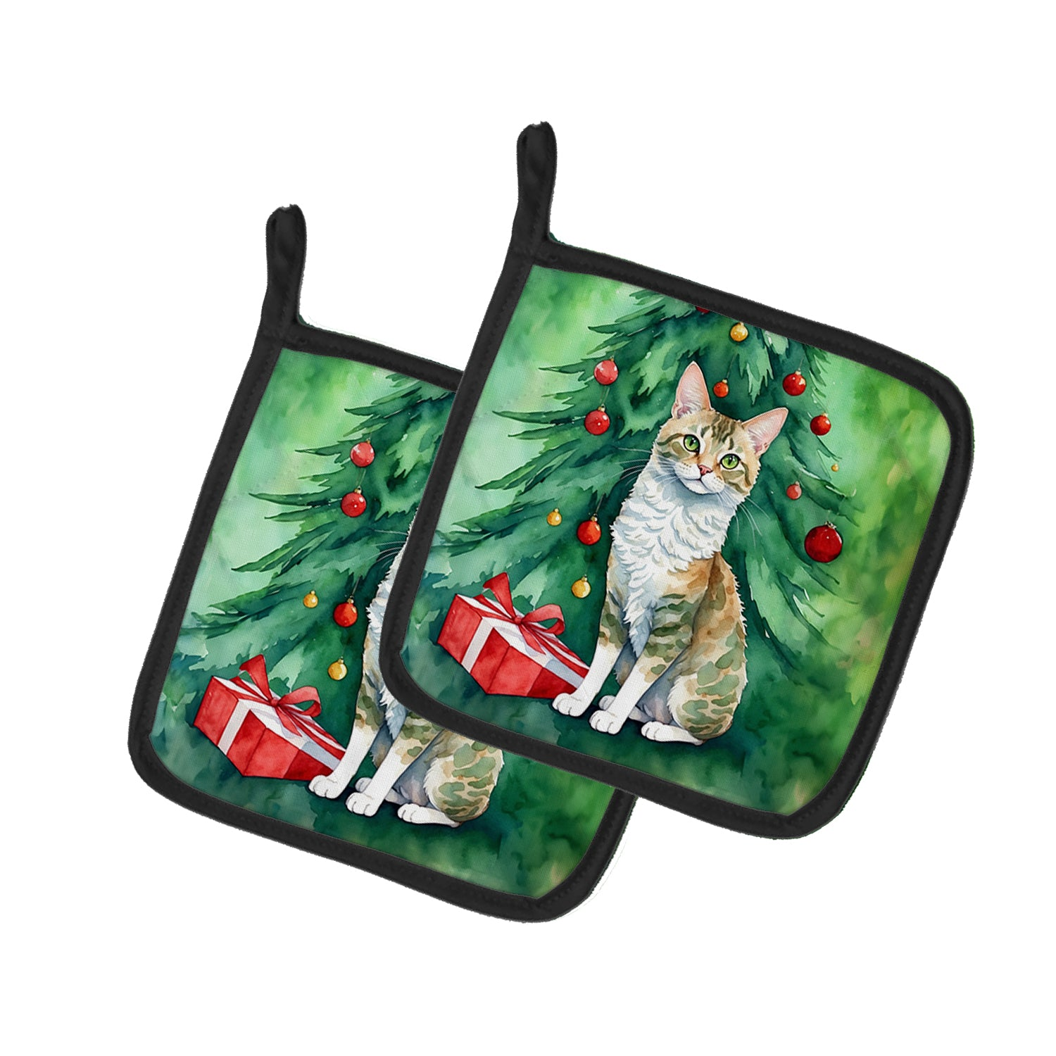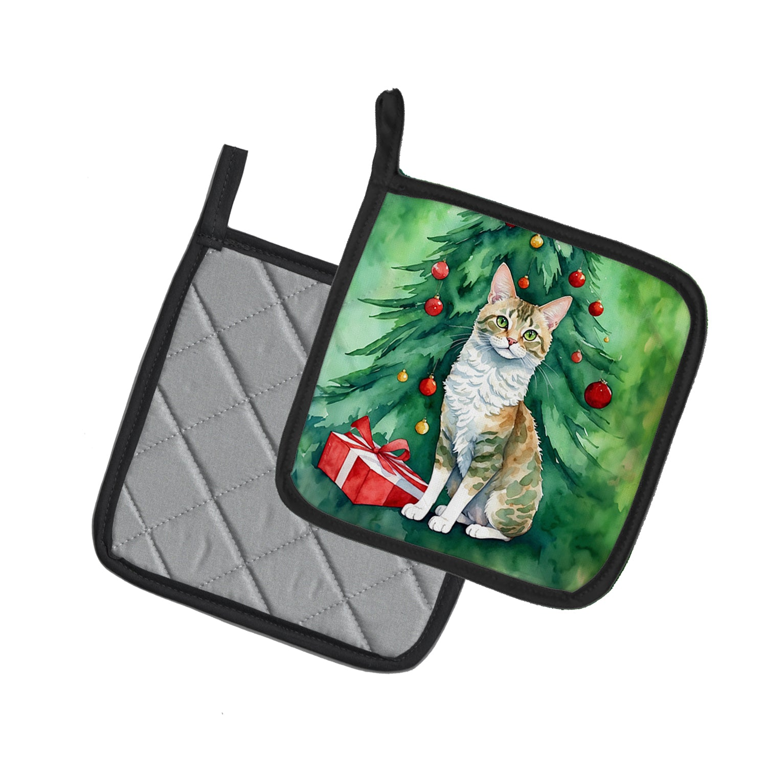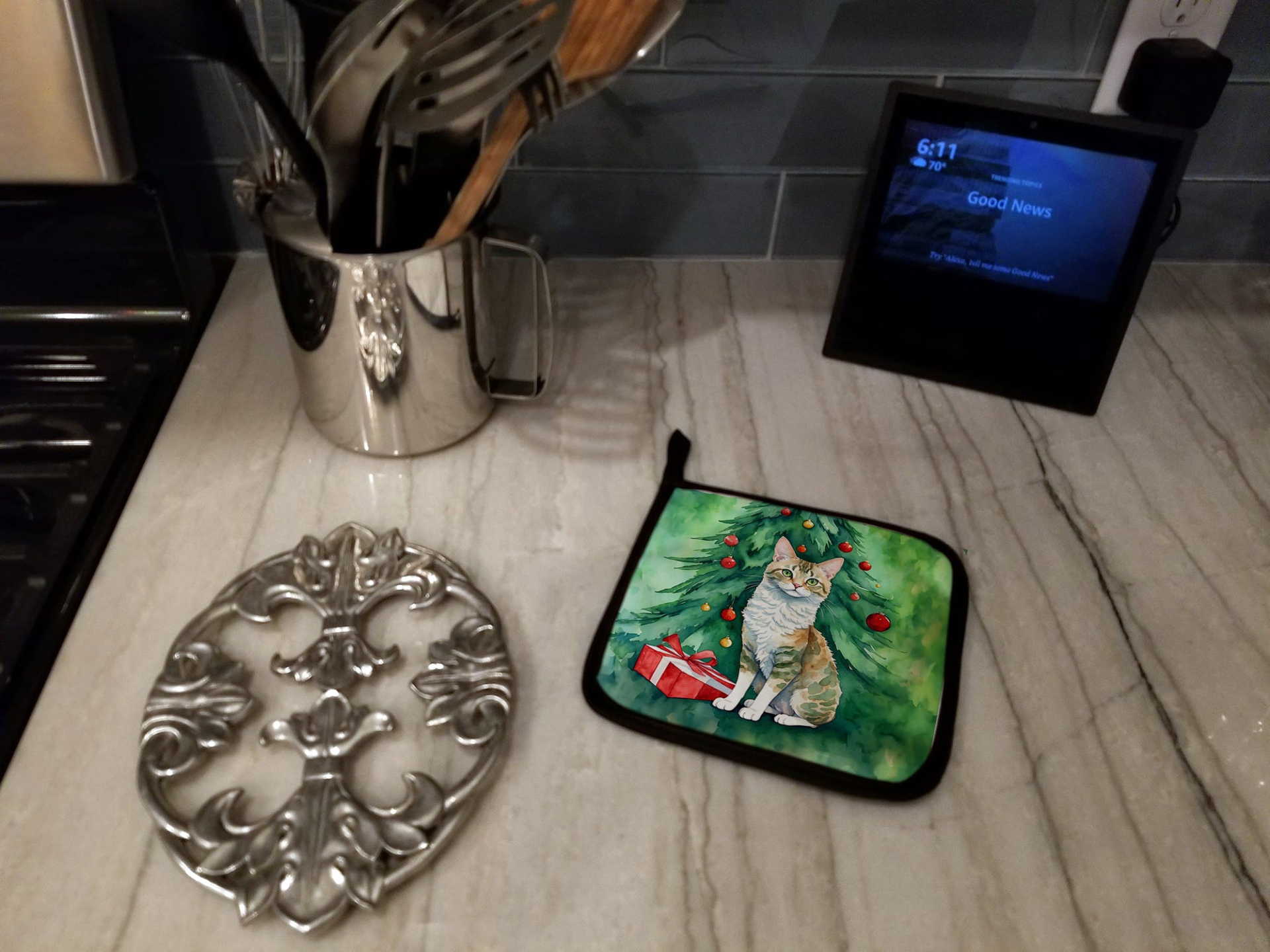 Pair of Pot Holders featuring breed specific Oregon Rex artwork. Celebrate Christmas with this Christmas Pair of Pot Holders. A Pair of Pot Holders to match your kitchen decor. Made in the USA these are thick and functional. Full color artwork decorates the front polyester fabric of the hot pad and accented by a black trim. Use these at as a trivet for your Thanksgiving or Christmas tablescape. Filled with insulated fabric and quilted for durability. These colorful pot holders will make a great gift for your favorite home cook or executive chef. Each pot holder measures approximately 7 1/2 inches by 7 1/2 inches. A hanging tab is included.