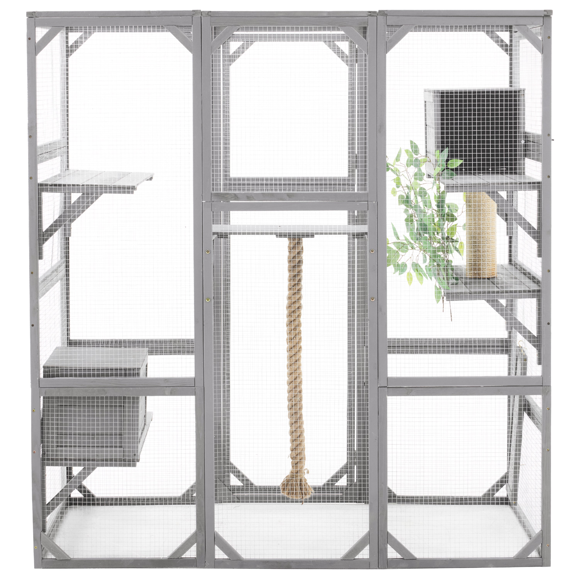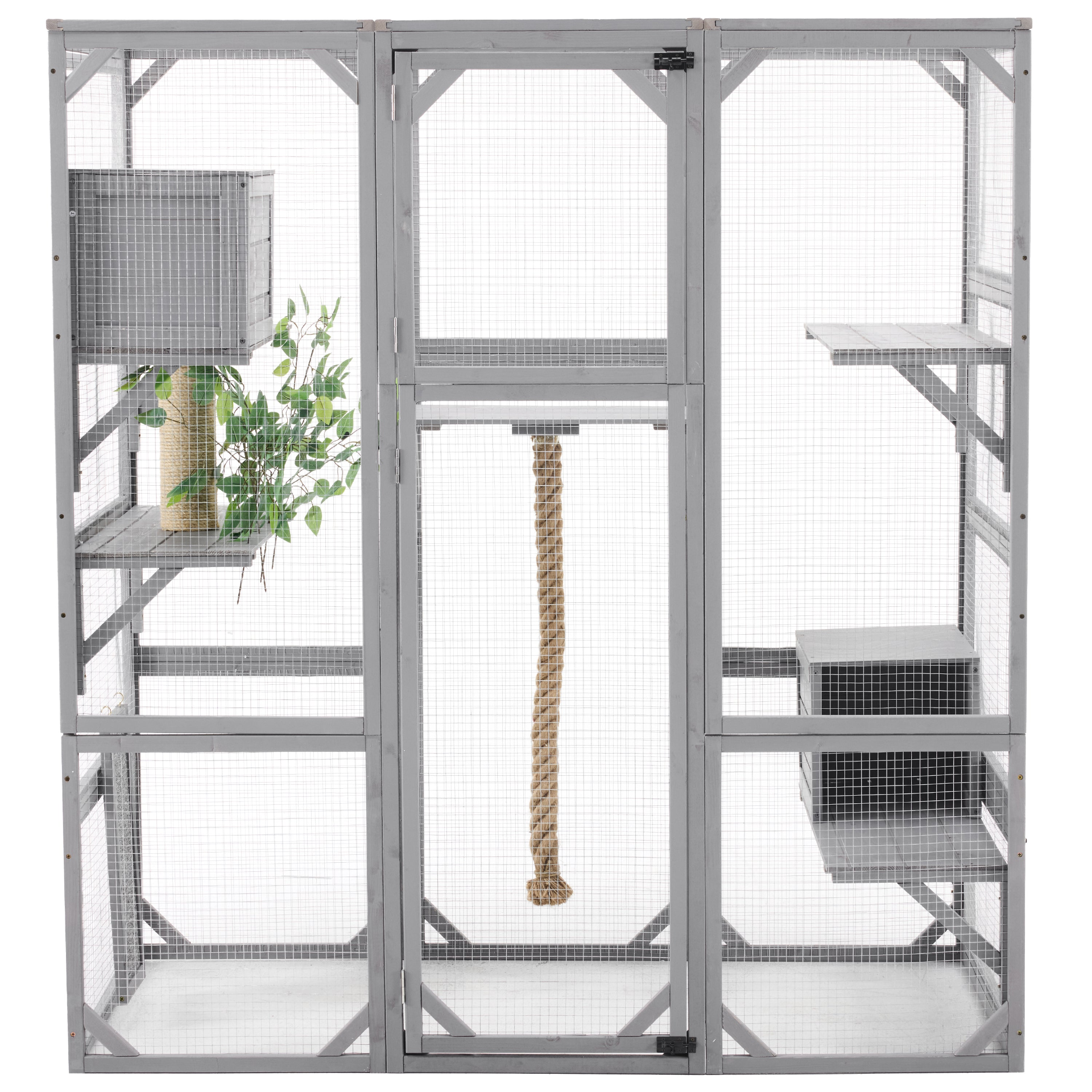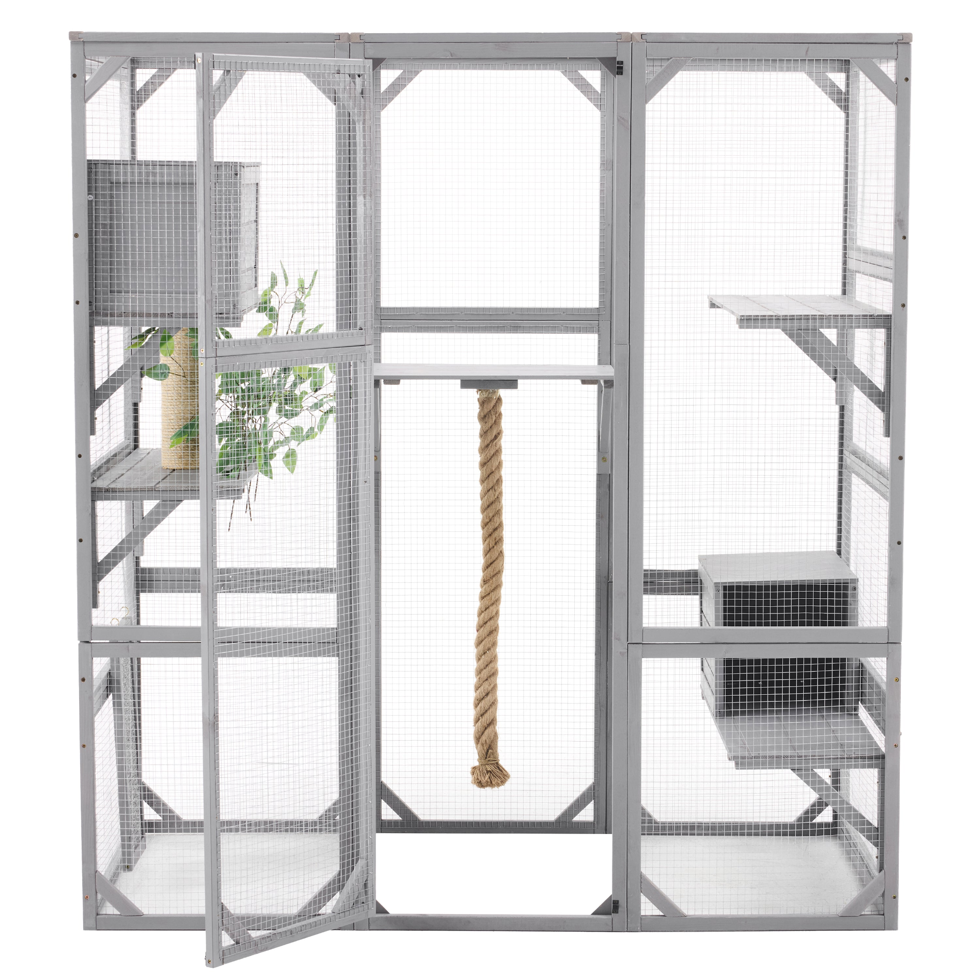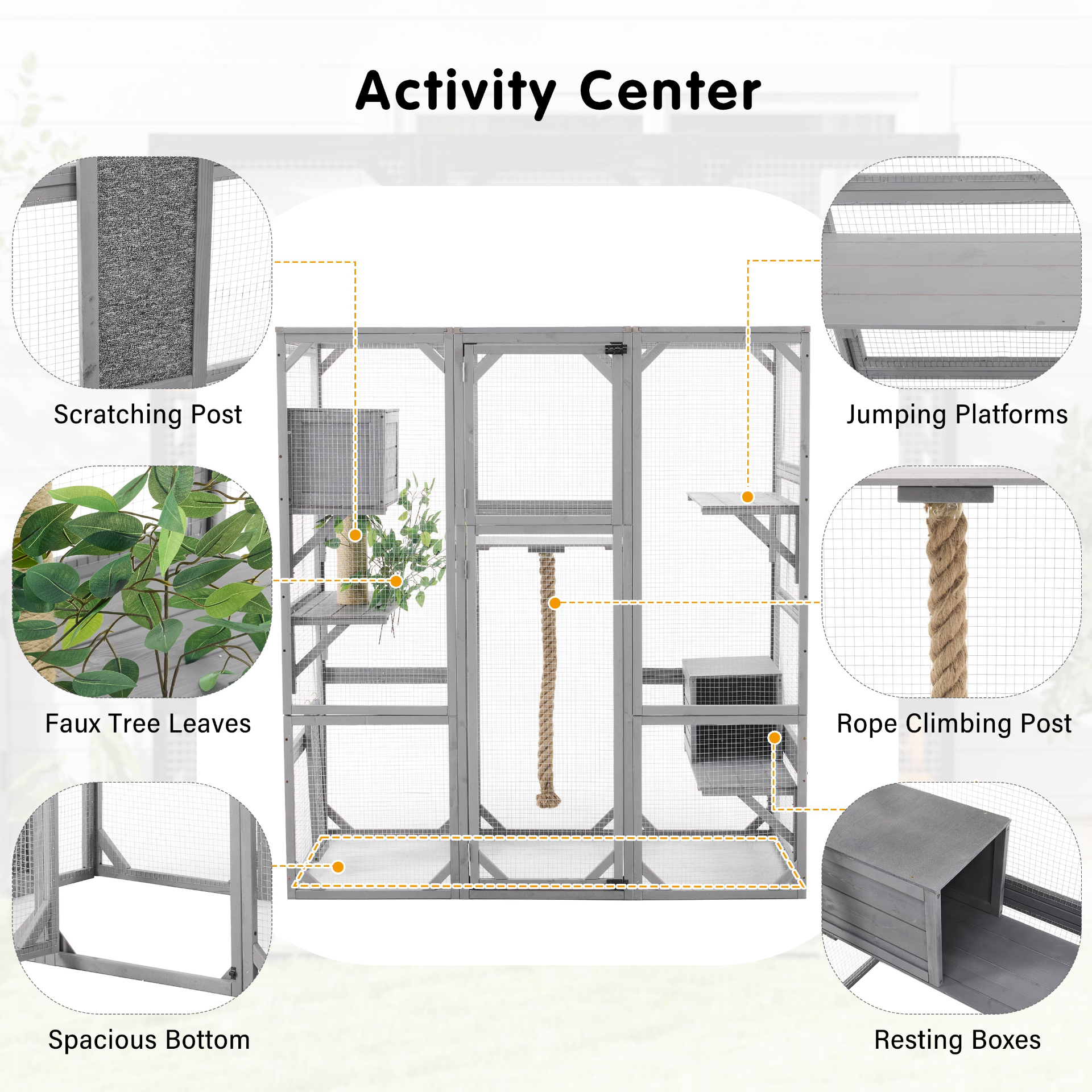 This outdoor walk-in cat enclosure offers a spacious and engaging environment for your cats, featuring multiple platforms for climbing, jumping, and exploring. It includes two cozy sleeping houses for privacy and rest, a rope climbing post, and a sturdy scratching post to satisfy your cat’s natural instincts. Built with high-quality pine wood and galvanized wire mesh, the enclosure is durable, weather-resistant, and ensures a safe space for your feline friends. The walk-in design, with easy access through front and back doors, allows for effortless interaction, cleaning, and feeding. Additionally, the faux tree leaves add a natural touch, creating a comfortable and stimulating environment that connects your cats to nature.