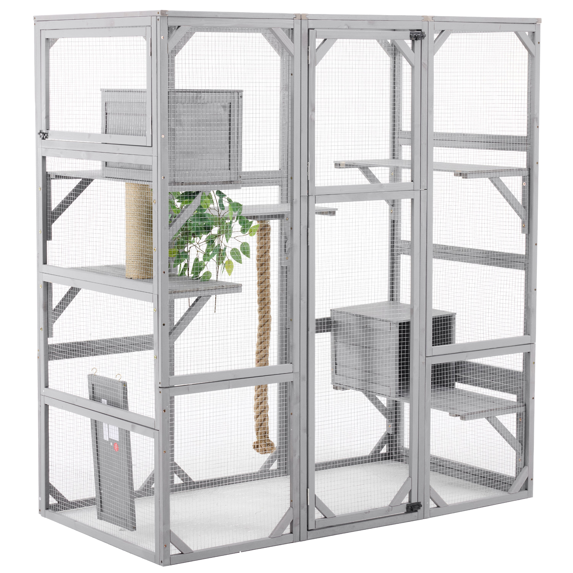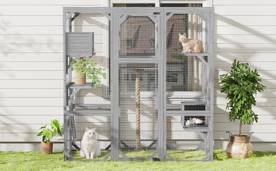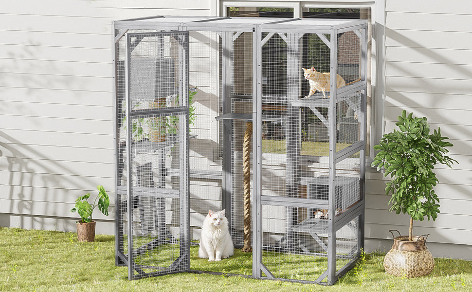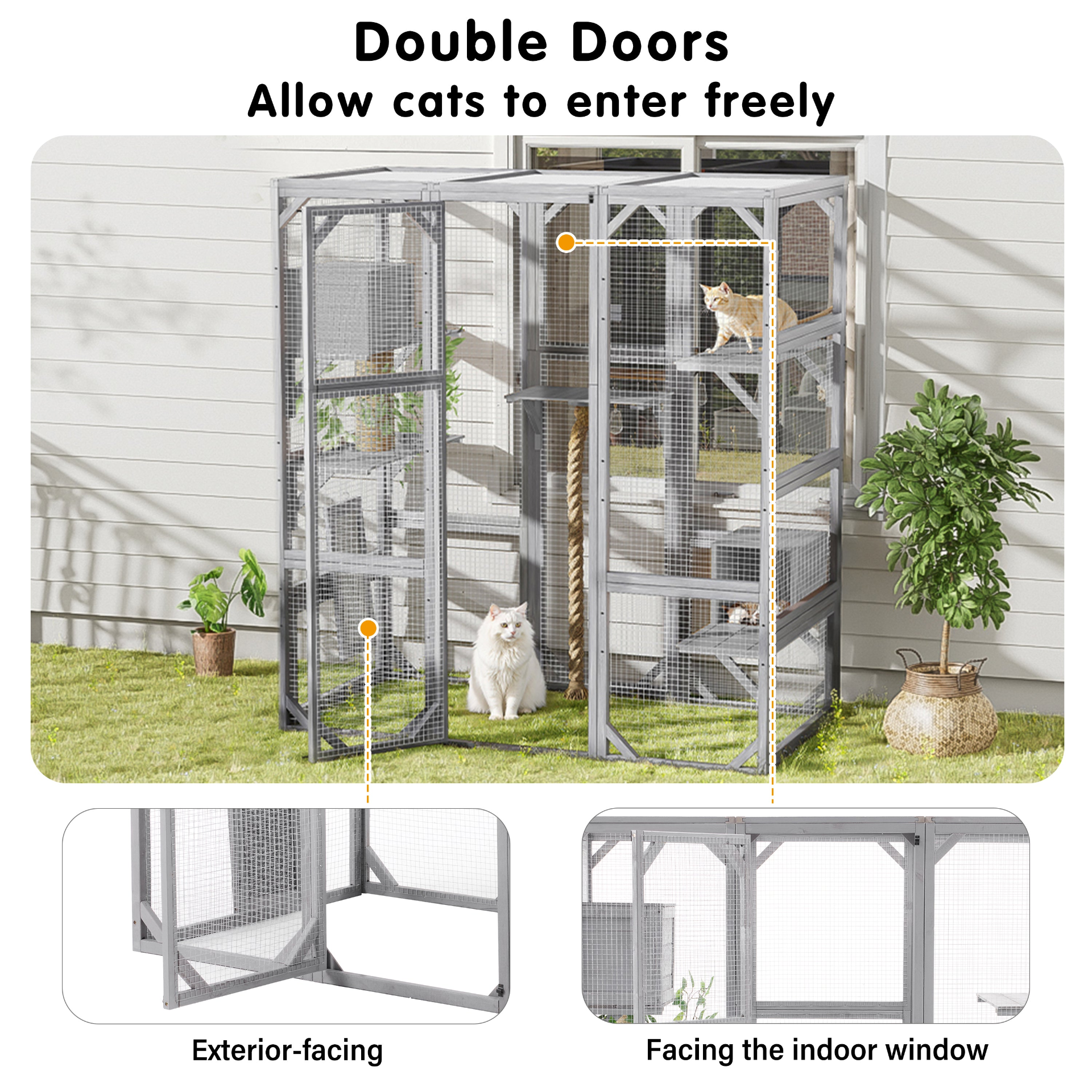 Outdoor Cat House, DIY Cat Enclosure Catio with Double Enter Doors, Light Grey Pine Wood, 62.8'L x 32.2'W x 68.5'H