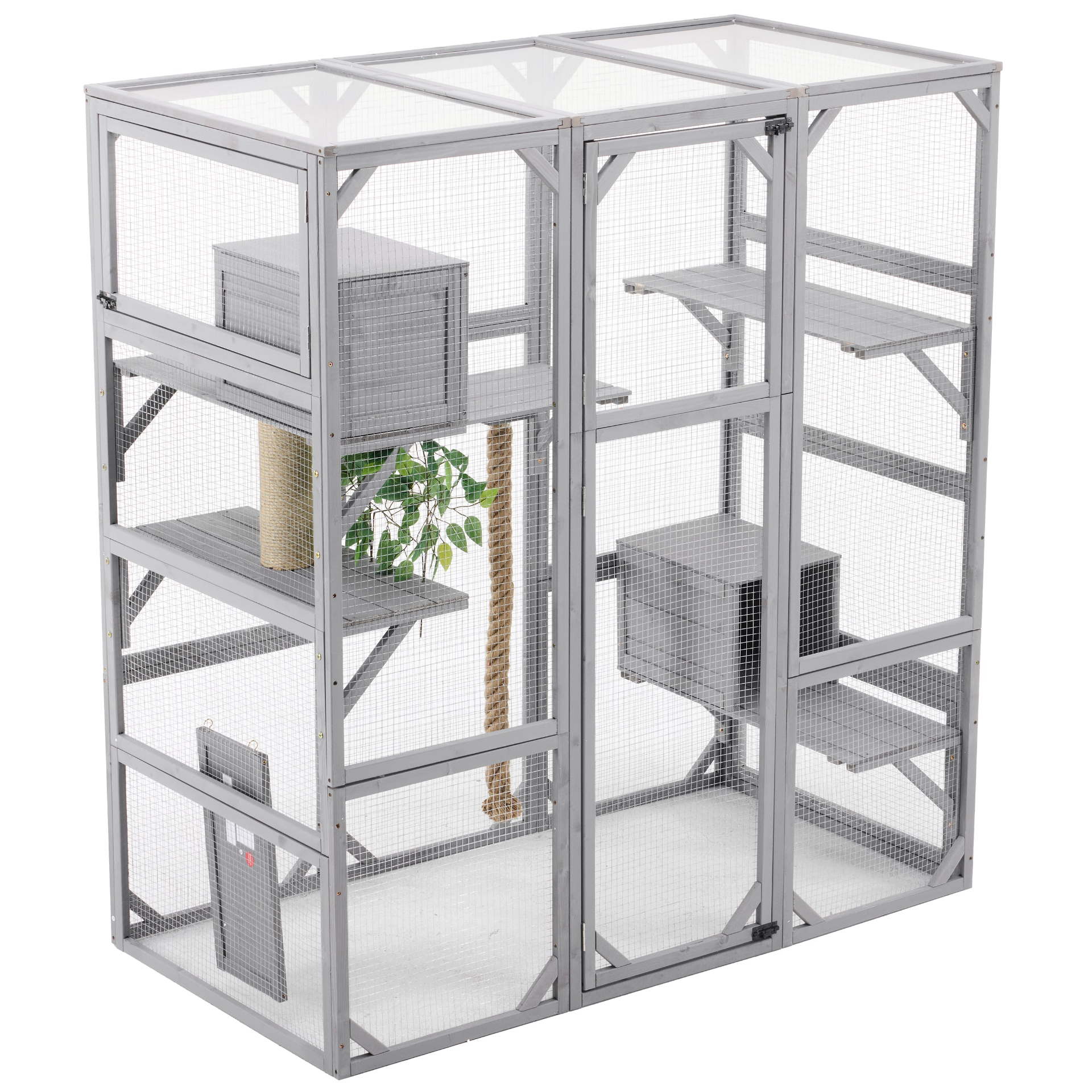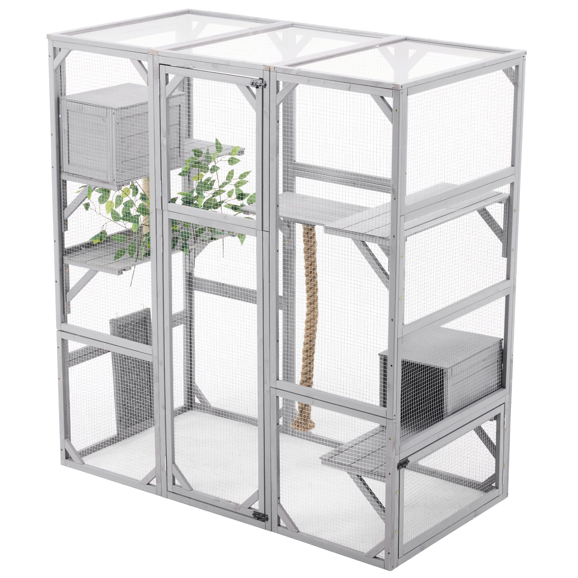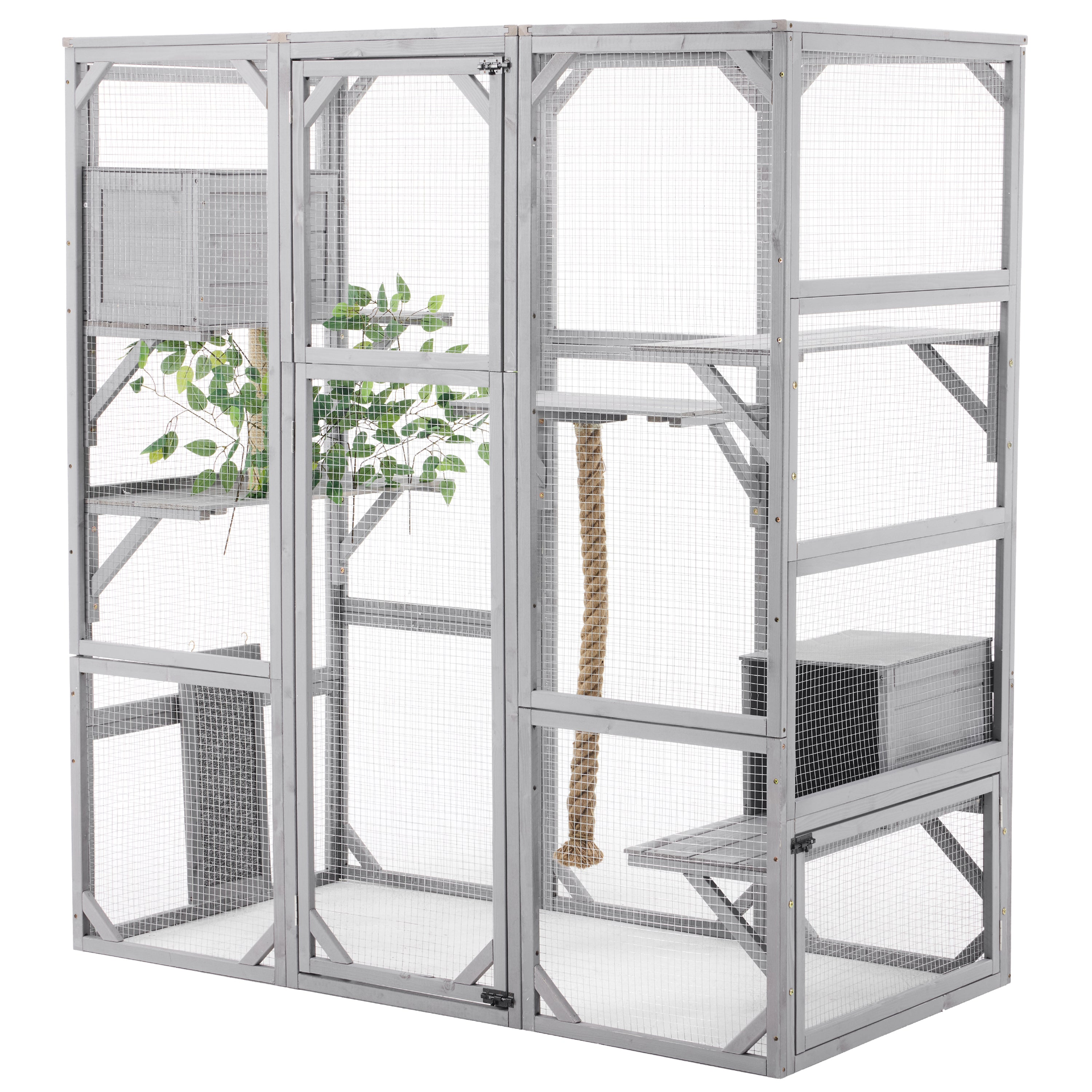 Outdoor Cat House, DIY Cat Enclosure Catio with Double Enter Doors, Light Grey Pine Wood, 62.8'L x 32.2'W x 68.5'H