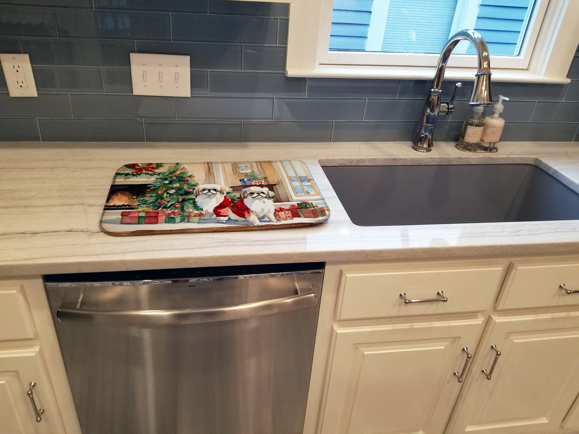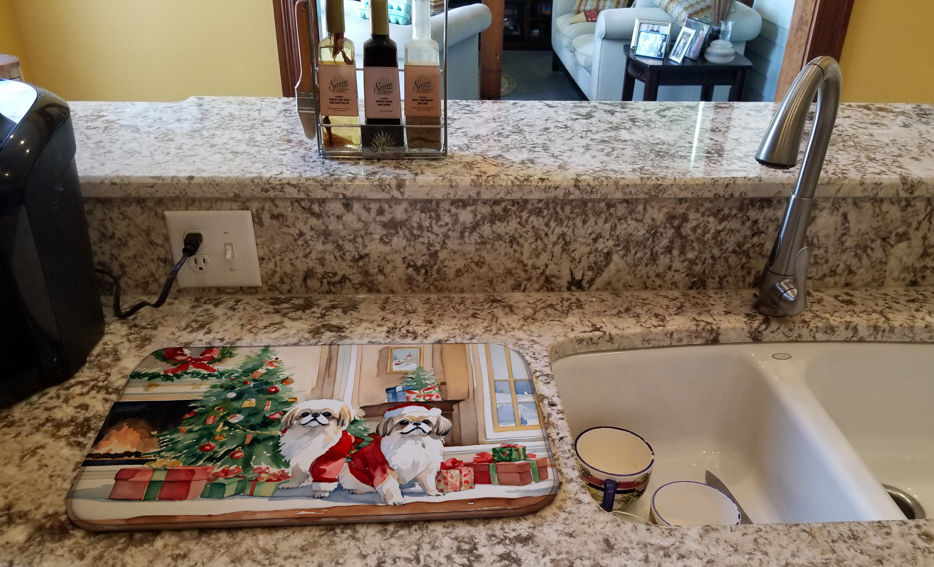 Dish Drying Mat featuring breed specific Pekingese artwork. Celebrate Christmas with this Christmas Dish Drying Mat. Say goodbye to messy countertops and soggy dish towels with our innovative dish drying mat. Our high-quality dish drying pad is designed to keep your countertops dry while offering a stylish and efficient solution. Whether you're air drying dishes, glasses, stemware, silverware, pots, pans, bottles, or even fruits and vegetables, our dish mat is the perfect choice. The 14 inches x 22 inches size fits most counters and dish drying racks, and the non-slip design ensures stability. Made with water-absorbent polyester and a polyurethane foam insert, our dish drying mat is not only functional but also durable. It's machine washable and printed in the USA for long-lasting use. The beautiful artwork adds flair to your kitchen decor, making it a perfect housewarming gift or present for any occasion. Upgrade your kitchen experience with our absorbent and versatile dish drying mat.