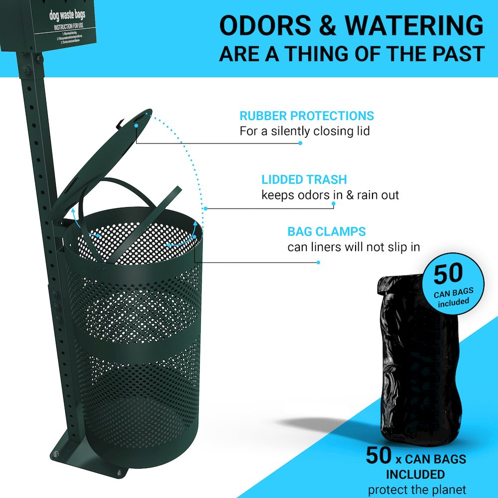 Heavy Duty Green Powder Coated Galvanized Steel High Visibility Glow-In-The-Dark Signage Locking Triple Roll Waste Bag Dispenser Hand Sanitizer Bottle Included Includes 2 Locking Dispenser Keys, 600 Roll Bags and 50 Trash Liners Assembles in 30 Minutes or Less Suitable for Commercial and Residential Use Recommended Installation on Cement Ground Pad