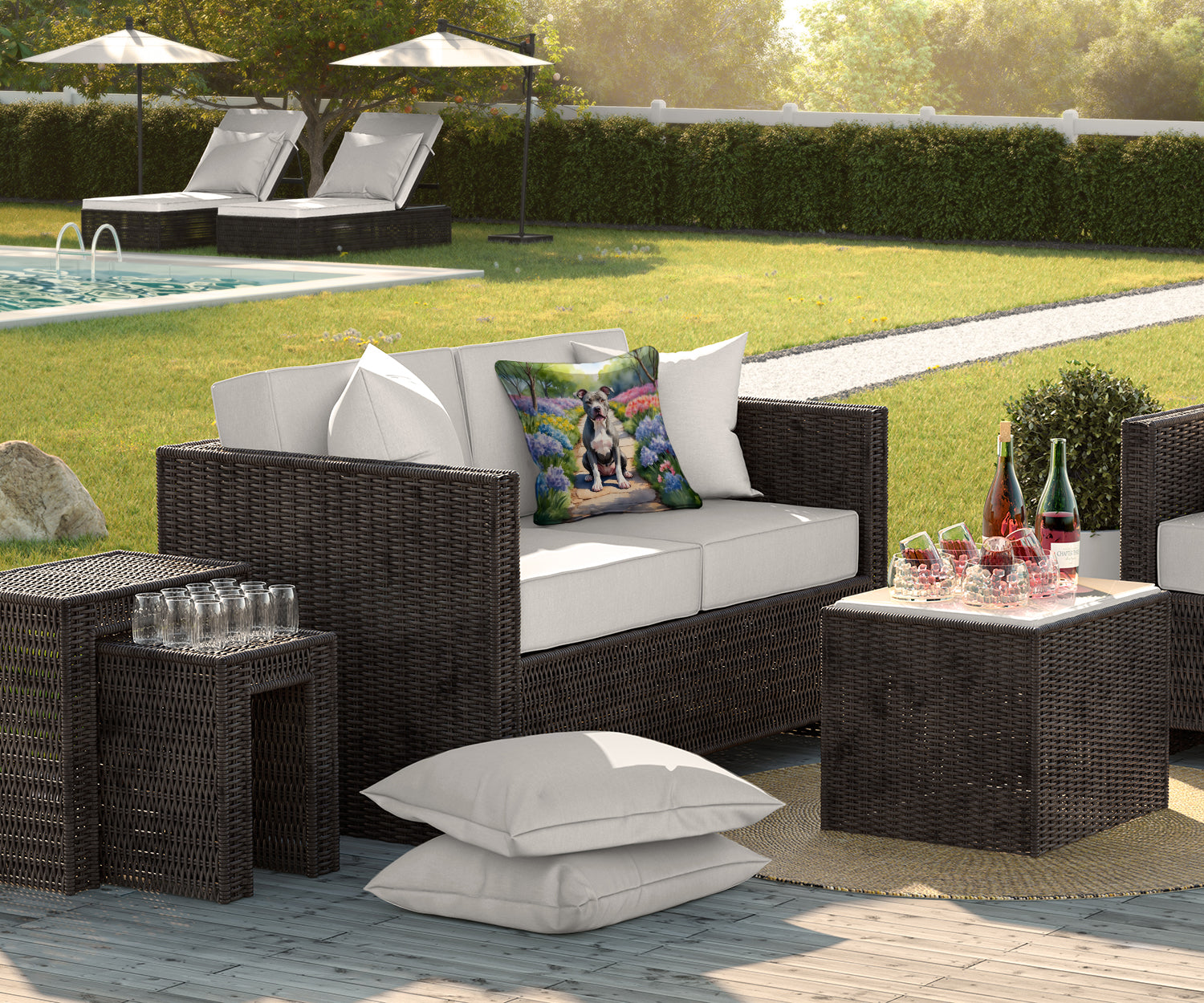 Throw Pillow featuring breed specific Pit Bull Terrier artwork. Revitalize your outdoor or indoor living space with Caroline's Treasures 18x18 Fabric Decorative Pillow. With a generously sized dimension of approximately 18 inches by 18 inches, this pillow makes a comfortable and aesthetic addition to any seating area. Made from a unique, water-resistant material developed by Caroline's Treasures, the pillow sham is 100% polyester fabric that's durable and ready to weather any condition. Its vibrant, full-color artwork will not fade over time as it is dyed with color-fast dyes. Whether you place it on your patio furniture, porch, veranda, or indoor couch, its soft canvas fabric ensures a cozy experience. The pillow is handcrafted in the United States, featuring a sham created from three pieces of fabric and a polyester insert for enduring shape and overstuffed comfort. Despite being robustly built to endure the outdoors, it is as soft and snug as your favorite indoor cushions. Please note, as all our pillows are handmade, sizes may vary slightly, adding to the charm of this unique decorative item.