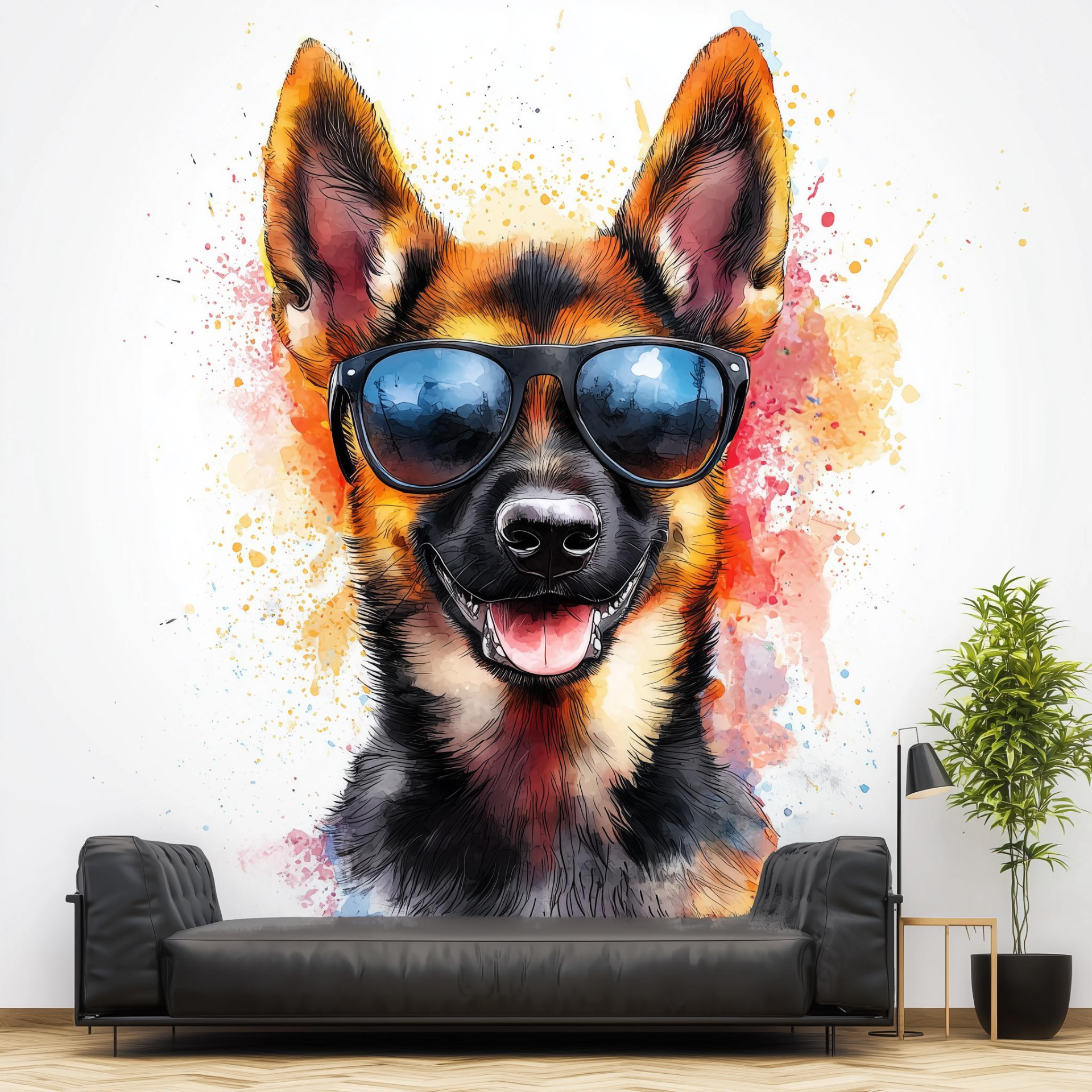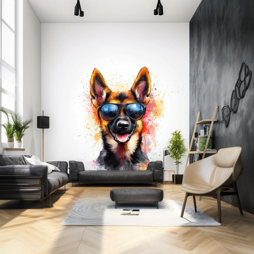 - High-quality, easy-to-apply wall sticker featuring a cute German Shepherd with sunglasses
