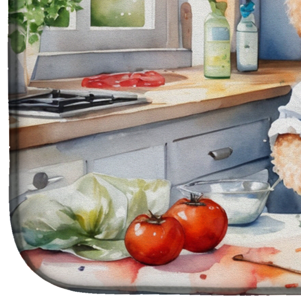 Dish Drying Mat featuring breed specific Poodle artwork. Say goodbye to messy countertops and soggy dish towels with our innovative dish drying mat. Our high-quality dish drying pad is designed to keep your countertops dry while offering a stylish and efficient solution. Whether you're air drying dishes, glasses, stemware, silverware, pots, pans, bottles, or even fruits and vegetables, our dish mat is the perfect choice. The 14 inches x 22 inches size fits most counters and dish drying racks, and the non-slip design ensures stability. Made with water-absorbent polyester and a polyurethane foam insert, our dish drying mat is not only functional but also durable. It's machine washable and printed in the USA for long-lasting use. The beautiful artwork adds flair to your kitchen decor, making it a perfect housewarming gift or present for any occasion. Upgrade your kitchen experience with our absorbent and versatile dish drying mat.