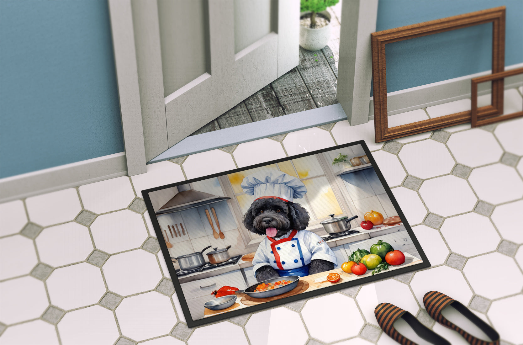 Doormat featuring breed specific Portuguese Water Dog artwork. Welcome your guests in style with our Artwork Door Mat, designed to withstand almost any weather condition. This mat, measuring approximately 18 by 27 inches, is held together by durable black binding tape. Its top layer, composed of polyester felt, is dyed with the eye-catching image you see on the mat. A few layers below provide the mat with stability, while its rubber bottom is stamped to help prevent slipping and ensures safety. Our mat works wonderfully as both an indoor or outdoor door mat. For cleaning, simply hose it off with water or use a power washer - no need for any cleaner that produces suds. Avoid scrubbing with a brush, instead, opt for the vacuum on floor setting. Designed manufactured and printed in the USA, this mat is a perfect addition to your porch, outdoor kitchen, entryway, or any indoor space. Its unique design makes it a charming decorative rug that greets your guests and adds a stylish touch to your home decor.