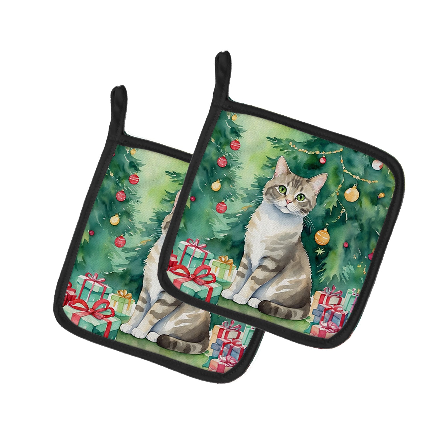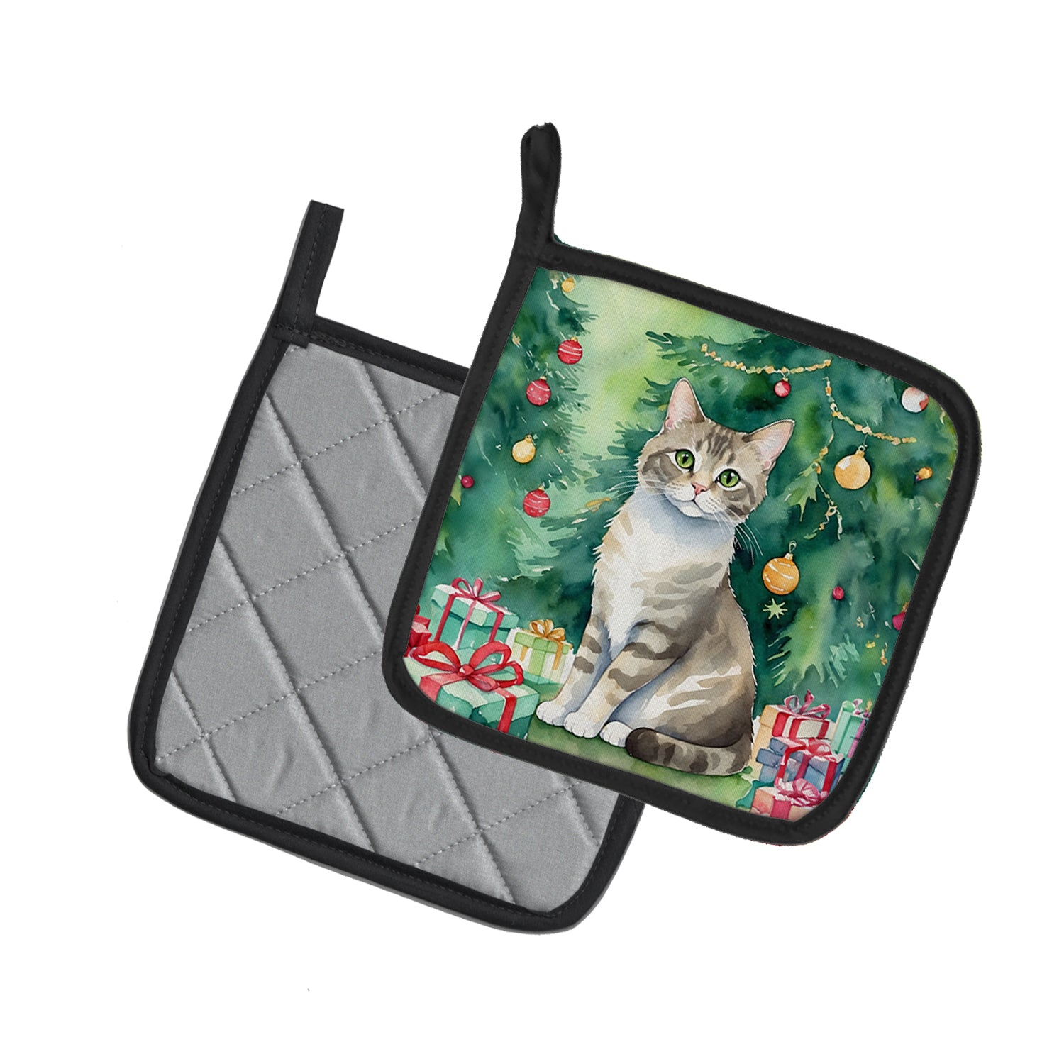 Pair of Pot Holders featuring breed specific Pudelkatze artwork. Celebrate Christmas with this Christmas Pair of Pot Holders. A Pair of Pot Holders to match your kitchen decor. Made in the USA these are thick and functional. Full color artwork decorates the front polyester fabric of the hot pad and accented by a black trim. Use these at as a trivet for your Thanksgiving or Christmas tablescape. Filled with insulated fabric and quilted for durability. These colorful pot holders will make a great gift for your favorite home cook or executive chef. Each pot holder measures approximately 7 1/2 inches by 7 1/2 inches. A hanging tab is included.