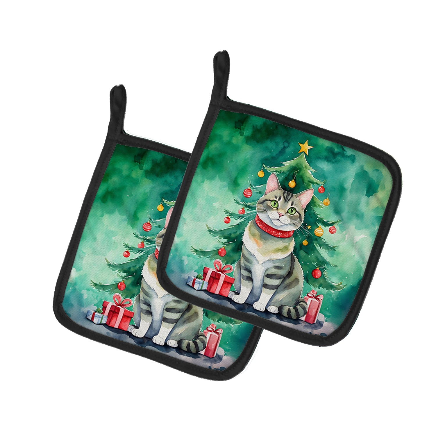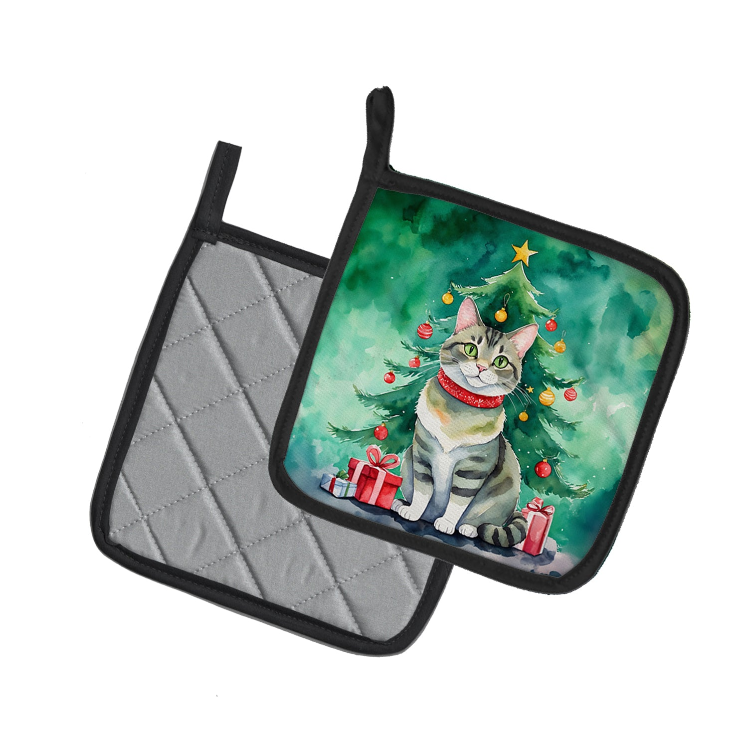 Pair of Pot Holders featuring breed specific Raas Cat artwork. Celebrate Christmas with this Christmas Pair of Pot Holders. A Pair of Pot Holders to match your kitchen decor. Made in the USA these are thick and functional. Full color artwork decorates the front polyester fabric of the hot pad and accented by a black trim. Use these at as a trivet for your Thanksgiving or Christmas tablescape. Filled with insulated fabric and quilted for durability. These colorful pot holders will make a great gift for your favorite home cook or executive chef. Each pot holder measures approximately 7 1/2 inches by 7 1/2 inches. A hanging tab is included.