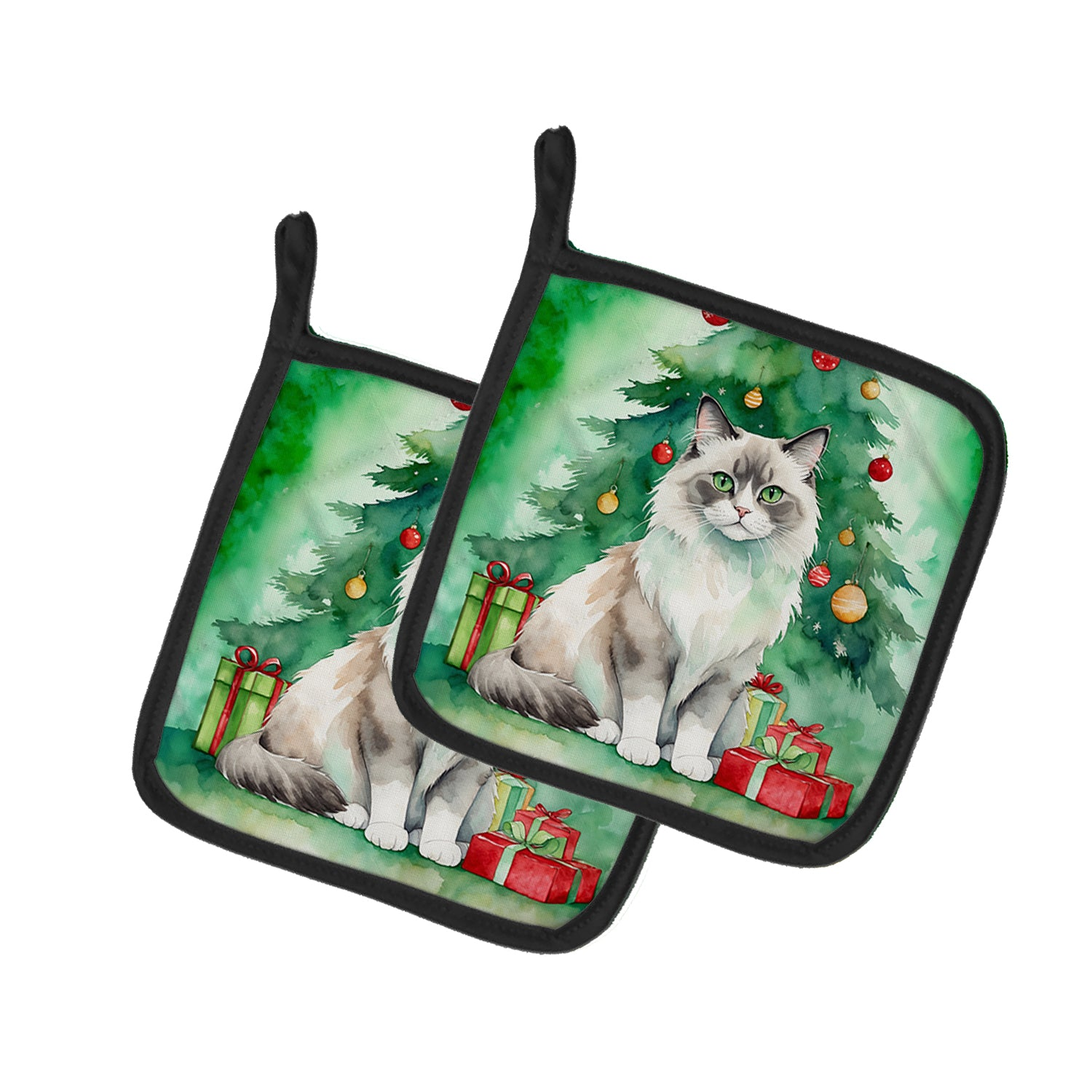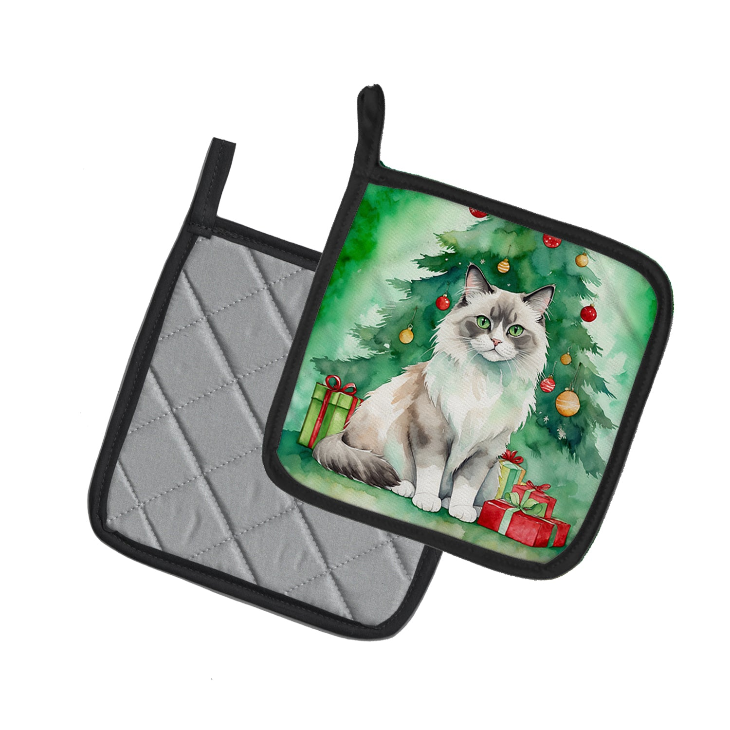 Pair of Pot Holders featuring breed specific Ragdoll artwork. Celebrate Christmas with this Christmas Pair of Pot Holders. A Pair of Pot Holders to match your kitchen decor. Made in the USA these are thick and functional. Full color artwork decorates the front polyester fabric of the hot pad and accented by a black trim. Use these at as a trivet for your Thanksgiving or Christmas tablescape. Filled with insulated fabric and quilted for durability. These colorful pot holders will make a great gift for your favorite home cook or executive chef. Each pot holder measures approximately 7 1/2 inches by 7 1/2 inches. A hanging tab is included.