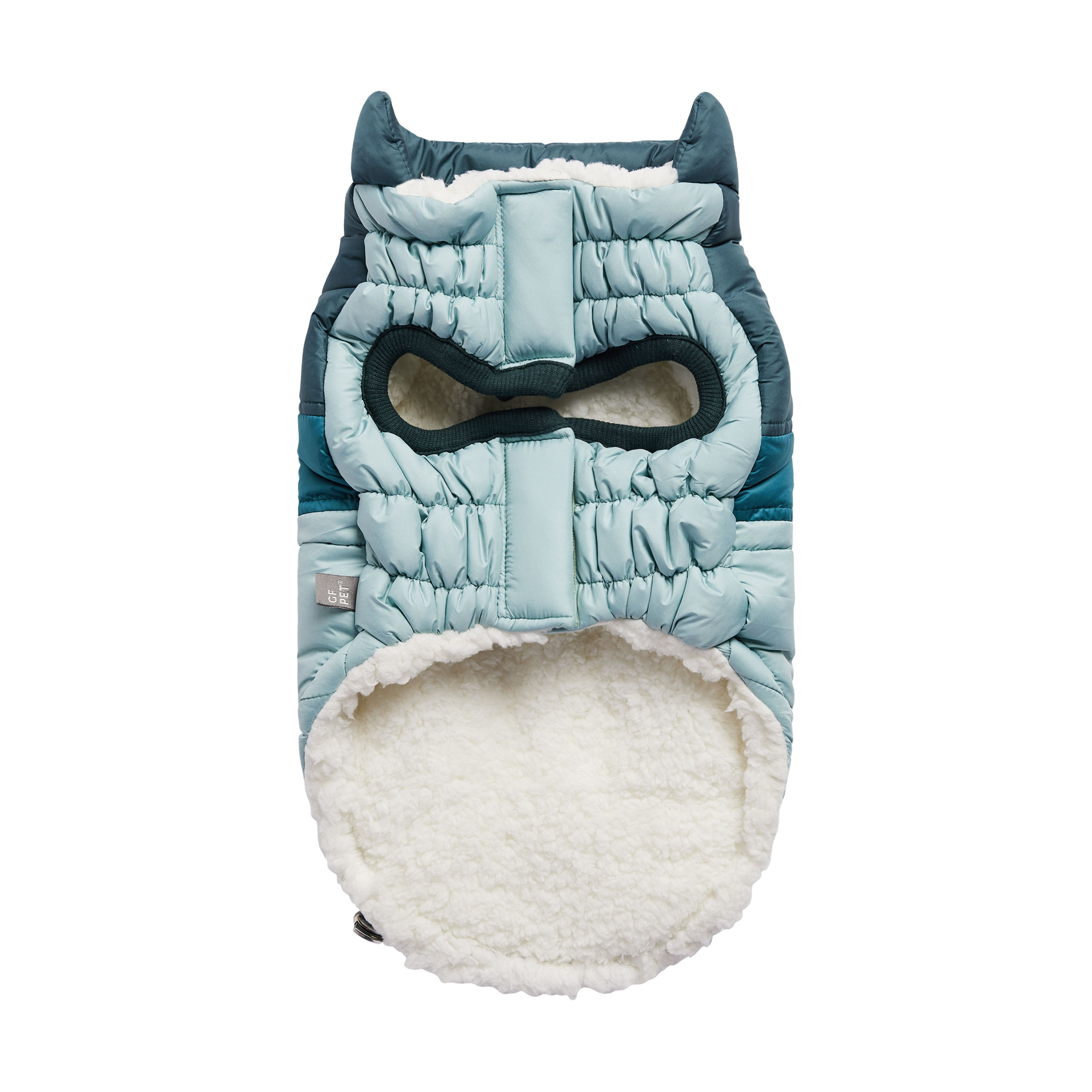 The GF PET Elasto-FIT Retro Puffer is a great choice for active dogs who are looking for the freshest carefree fashion and warmth. Its' ultra puff look and trendy color blocks are a stunning statement of canine vogue! Both retro and modern at the same time, this gorgeous puffer sports oversized faux pockets, accent stitching and next generation styling.  With GF PET signature pocket tabs & contrast binding, this retro puffer keeps it real with snuggly warm popcorn sherpa lining.  Water repellent and super adjustable, with patented Elasto-FIT technology! Designed for cool dogs!!