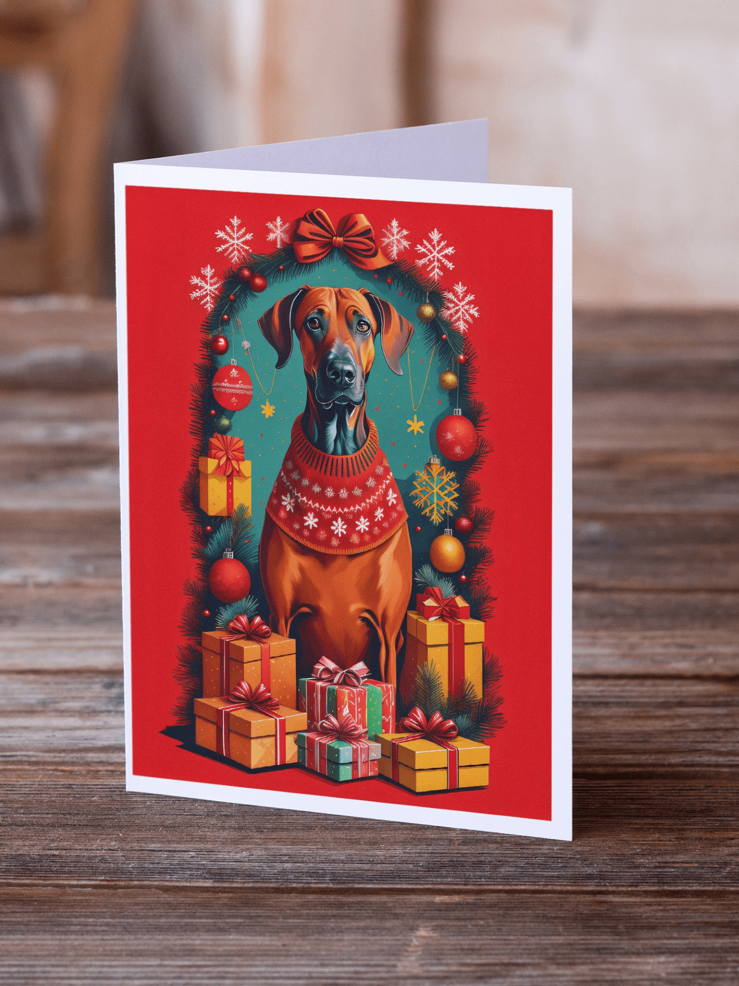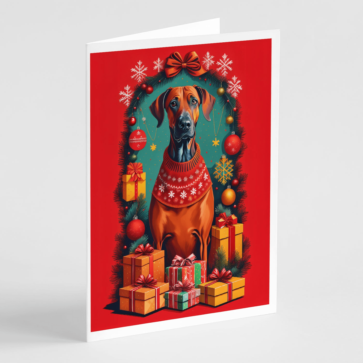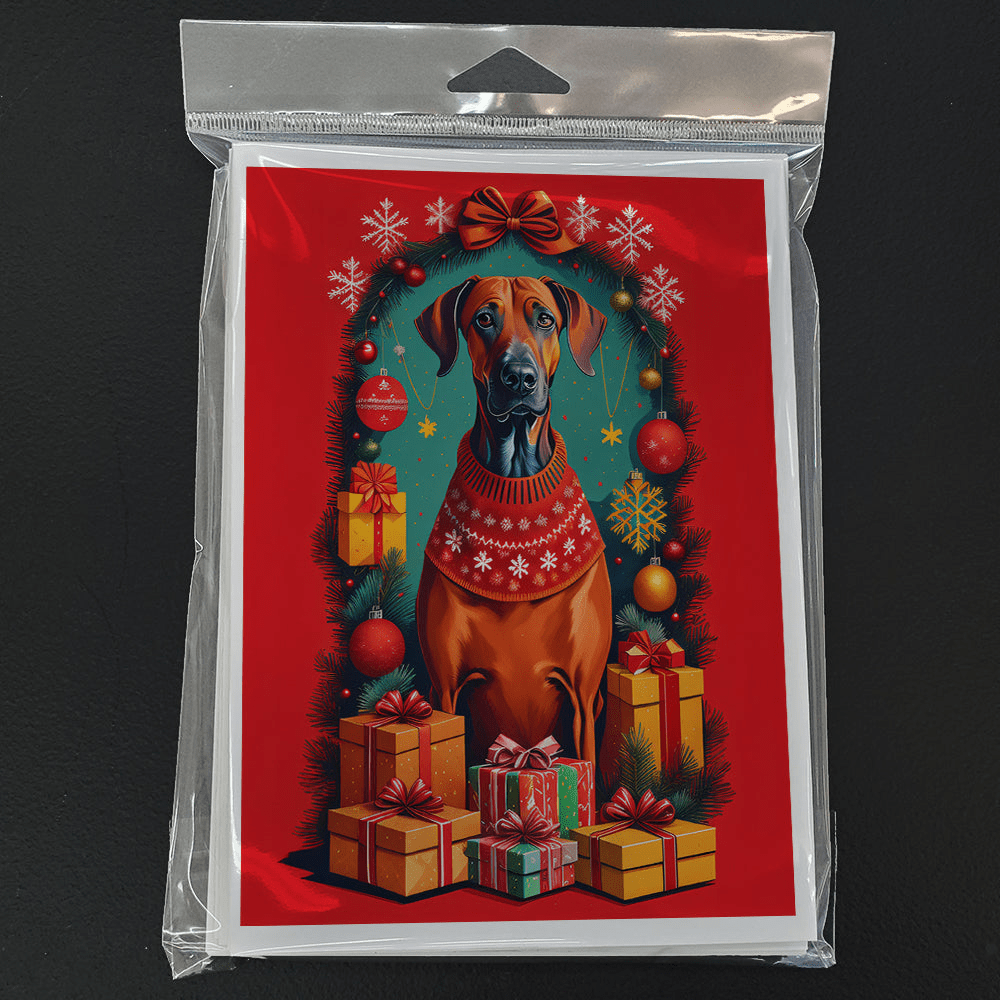 Greeting Cards Pack of 8 featuring breed specific Rhodesian Ridgeback artwork. Celebrate Christmas with this Christmas . Celebrate special moments with Caroline's Treasures Printed Greeting Card Pack. This pack includes eight beautifully folded 5x7 cards, accompanied by eight matching white envelopes. With blank interiors, these cards provide ample space for your personalized messages and heartfelt holiday greetings. Each card features captivating full-color artwork, meticulously printed in our facility on high-quality 80 lb cover stock or 216 GSM. The super smooth finish of the white cards enhances the visual impact of the artwork, creating a truly stunning presentation. Designed by our talented in-house artists or licensed artists, the artwork on these cards showcases their creativity and attention to detail. From vibrant illustrations to captivating designs, each card tells its own unique story. Whether it's for birthdays, anniversaries, holidays, or any special occasion, Caroline's Treasures Greeting Card Pack is the perfect way to convey your heartfelt sentiments. Share joy, love, and warm wishes with these exquisite cards and make every moment unforgettable.