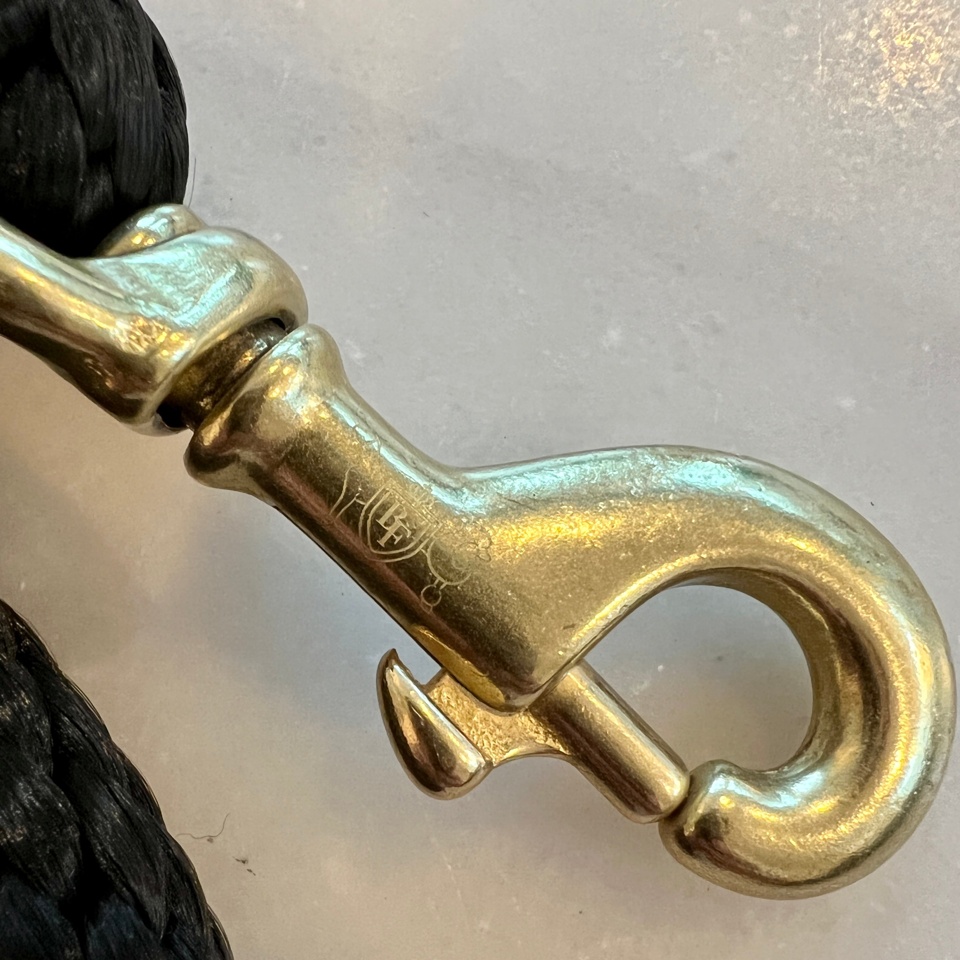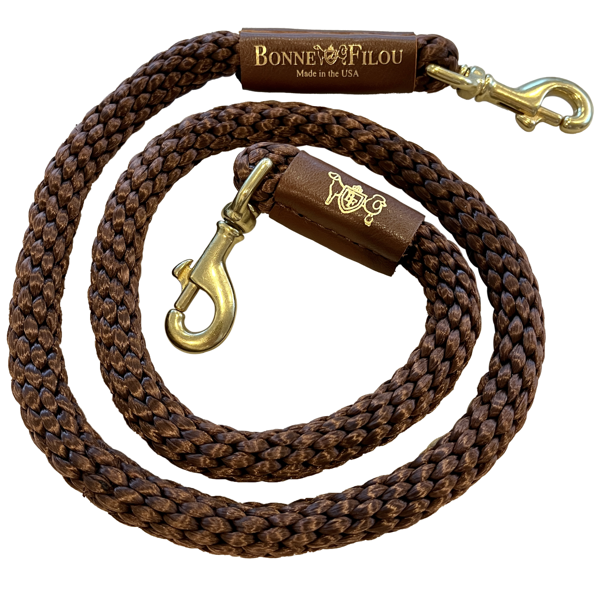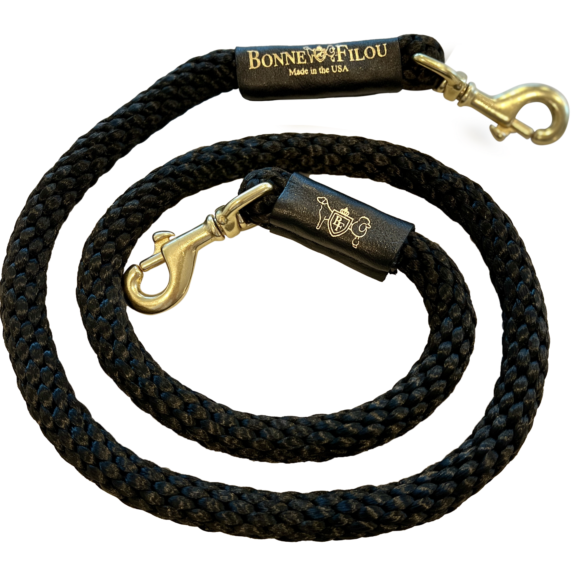 This leash is 4' in length (when paired to our shearling fur grip, it is a 5’ full leash), with 2 genuine leather foiled Bonne et Filou sleeves and 2 durable solid brass swivel snaps (with Bonne Et Filou logo lasered in).
