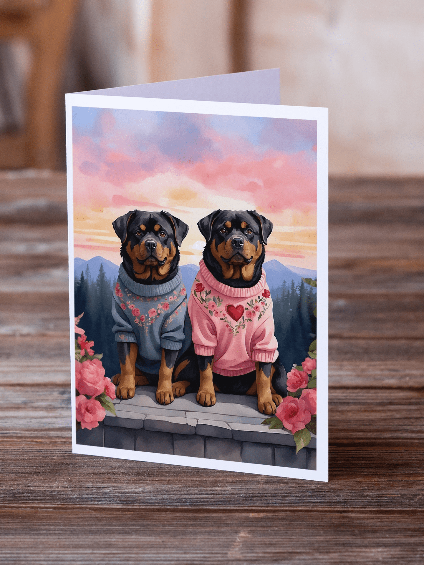 Greeting Cards Pack of 8 featuring breed specific Rottweiler artwork. Celebrate Valentine's Day with this Valentine's Day . Celebrate special moments with Caroline's Treasures Printed Greeting Card Pack. This pack includes eight beautifully folded 5x7 cards, accompanied by eight matching white envelopes. With blank interiors, these cards provide ample space for your personalized messages and heartfelt holiday greetings. Each card features captivating full-color artwork, meticulously printed in our facility on high-quality 80 lb cover stock or 216 GSM. The super smooth finish of the white cards enhances the visual impact of the artwork, creating a truly stunning presentation. Designed by our talented in-house artists or licensed artists, the artwork on these cards showcases their creativity and attention to detail. From vibrant illustrations to captivating designs, each card tells its own unique story. Whether it's for birthdays, anniversaries, holidays, or any special occasion, Caroline's Treasures Greeting Card Pack is the perfect way to convey your heartfelt sentiments. Share joy, love, and warm wishes with these exquisite cards and make every moment unforgettable.