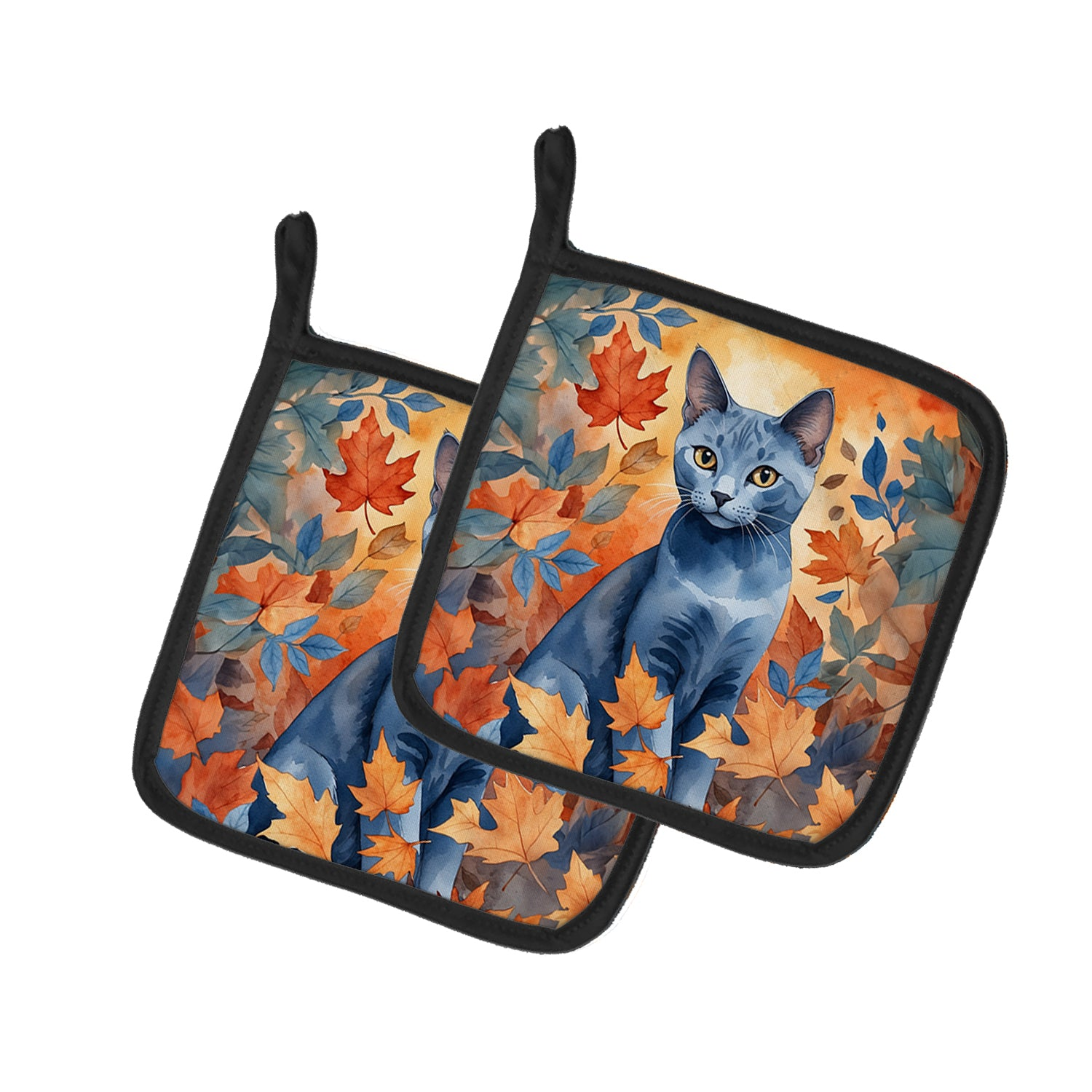 Pair of Pot Holders featuring breed specific Russian Blue artwork. A Pair of Pot Holders to match your kitchen decor. Made in the USA these are thick and functional. Full color artwork decorates the front polyester fabric of the hot pad and accented by a black trim. Use these at as a trivet for your Thanksgiving or Christmas tablescape. Filled with insulated fabric and quilted for durability. These colorful pot holders will make a great gift for your favorite home cook or executive chef. Each pot holder measures approximately 7 1/2 inches by 7 1/2 inches. A hanging tab is included.