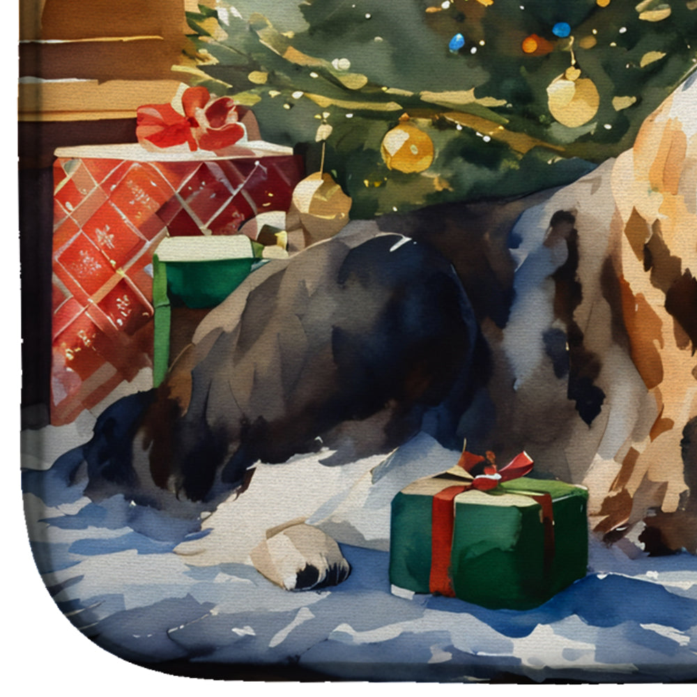 Dish Drying Mat featuring breed specific Saint Bernard artwork. Celebrate Christmas with this Christmas Dish Drying Mat. Say goodbye to messy countertops and soggy dish towels with our innovative dish drying mat. Our high-quality dish drying pad is designed to keep your countertops dry while offering a stylish and efficient solution. Whether you're air drying dishes, glasses, stemware, silverware, pots, pans, bottles, or even fruits and vegetables, our dish mat is the perfect choice. The 14 inches x 22 inches size fits most counters and dish drying racks, and the non-slip design ensures stability. Made with water-absorbent polyester and a polyurethane foam insert, our dish drying mat is not only functional but also durable. It's machine washable and printed in the USA for long-lasting use. The beautiful artwork adds flair to your kitchen decor, making it a perfect housewarming gift or present for any occasion. Upgrade your kitchen experience with our absorbent and versatile dish drying mat.