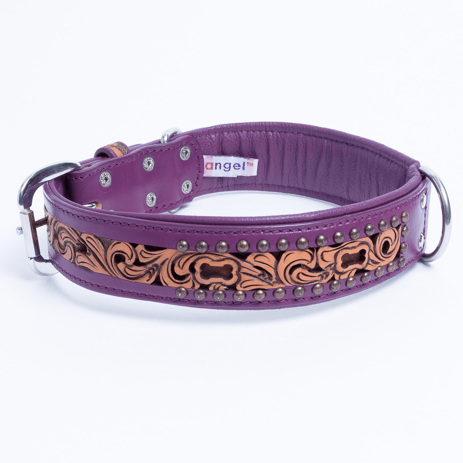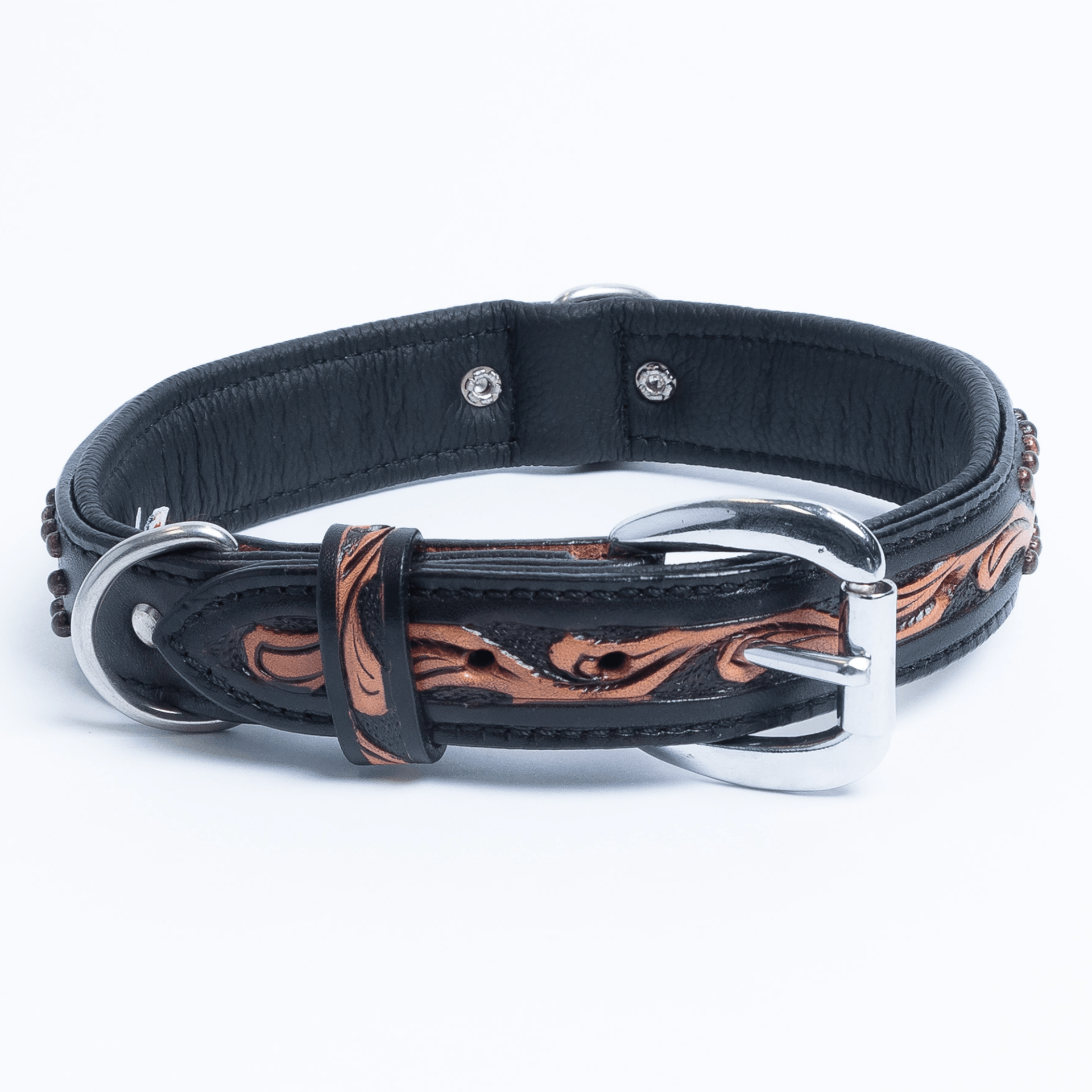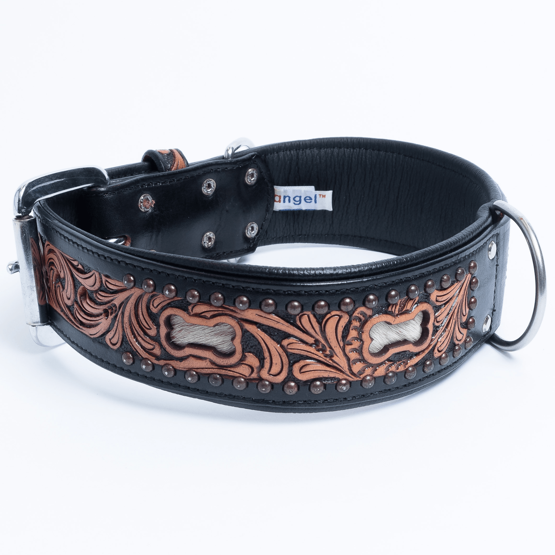 Give your dog a collar that truly tells a story with the San Antonio Hand-Carved Leather Dog Collar—an exquisite blend of craftsmanship, character, and bold Western flair. Each collar showcases intricate hand-carved detailing, hair-on leather accents, brass stud embellishments, and signature bone cutouts that instantly set it apart from ordinary designs. Built for both beauty and durability, it features a soft padded leather underside for unmatched comfort, stainless-steel D-rings for secure control, and a genuine brass buckle for long-lasting strength. Available in two striking colors and four versatile sizes, this standout collar brings artisan style to your dog’s everyday adventures.