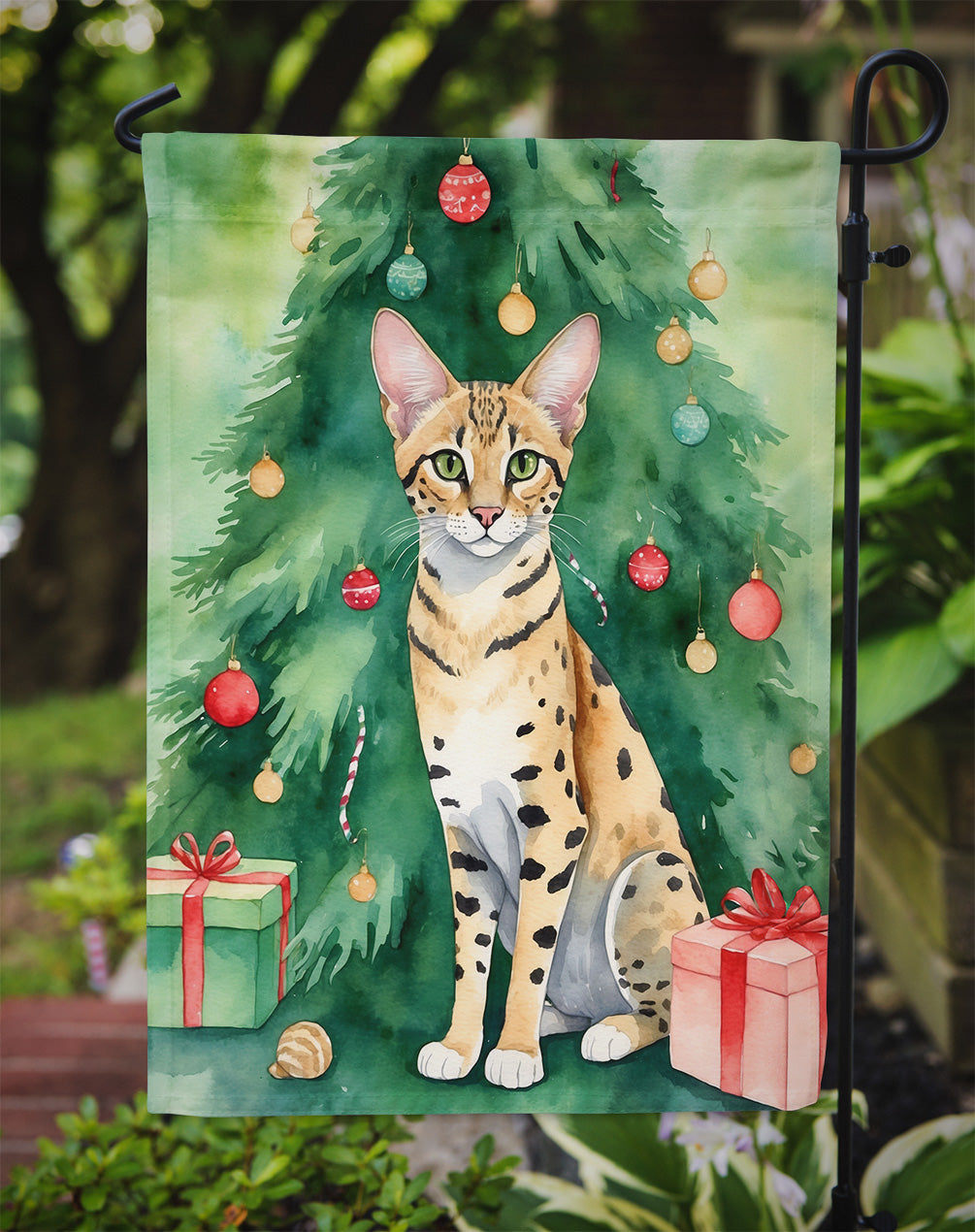 Savannah Cat By the Christmas Tree Garden Flag