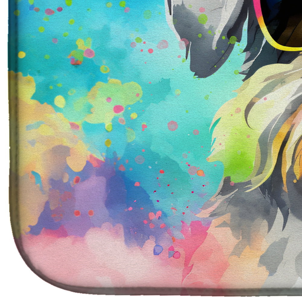 Dish Drying Mat featuring breed specific Schnauzer artwork. Say goodbye to messy countertops and soggy dish towels with our innovative dish drying mat. Our high-quality dish drying pad is designed to keep your countertops dry while offering a stylish and efficient solution. Whether you're air drying dishes, glasses, stemware, silverware, pots, pans, bottles, or even fruits and vegetables, our dish mat is the perfect choice. The 14 inches x 22 inches size fits most counters and dish drying racks, and the non-slip design ensures stability. Made with water-absorbent polyester and a polyurethane foam insert, our dish drying mat is not only functional but also durable. It's machine washable and printed in the USA for long-lasting use. The beautiful artwork adds flair to your kitchen decor, making it a perfect housewarming gift or present for any occasion. Upgrade your kitchen experience with our absorbent and versatile dish drying mat.