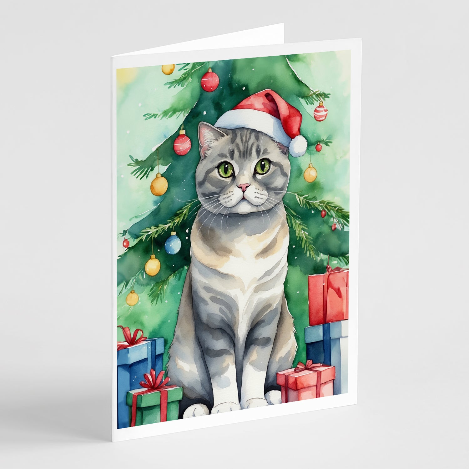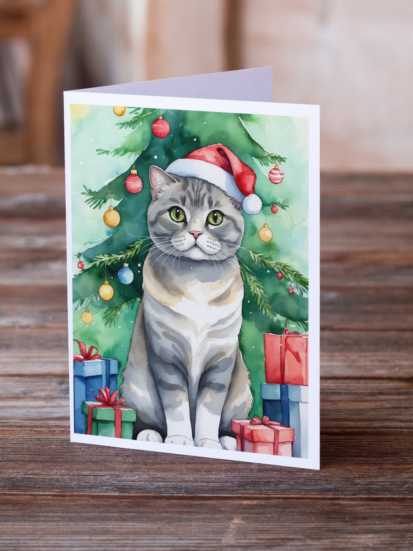 Scottish Fold Cat By the Christmas Tree Greeting Cards Pack of 8
