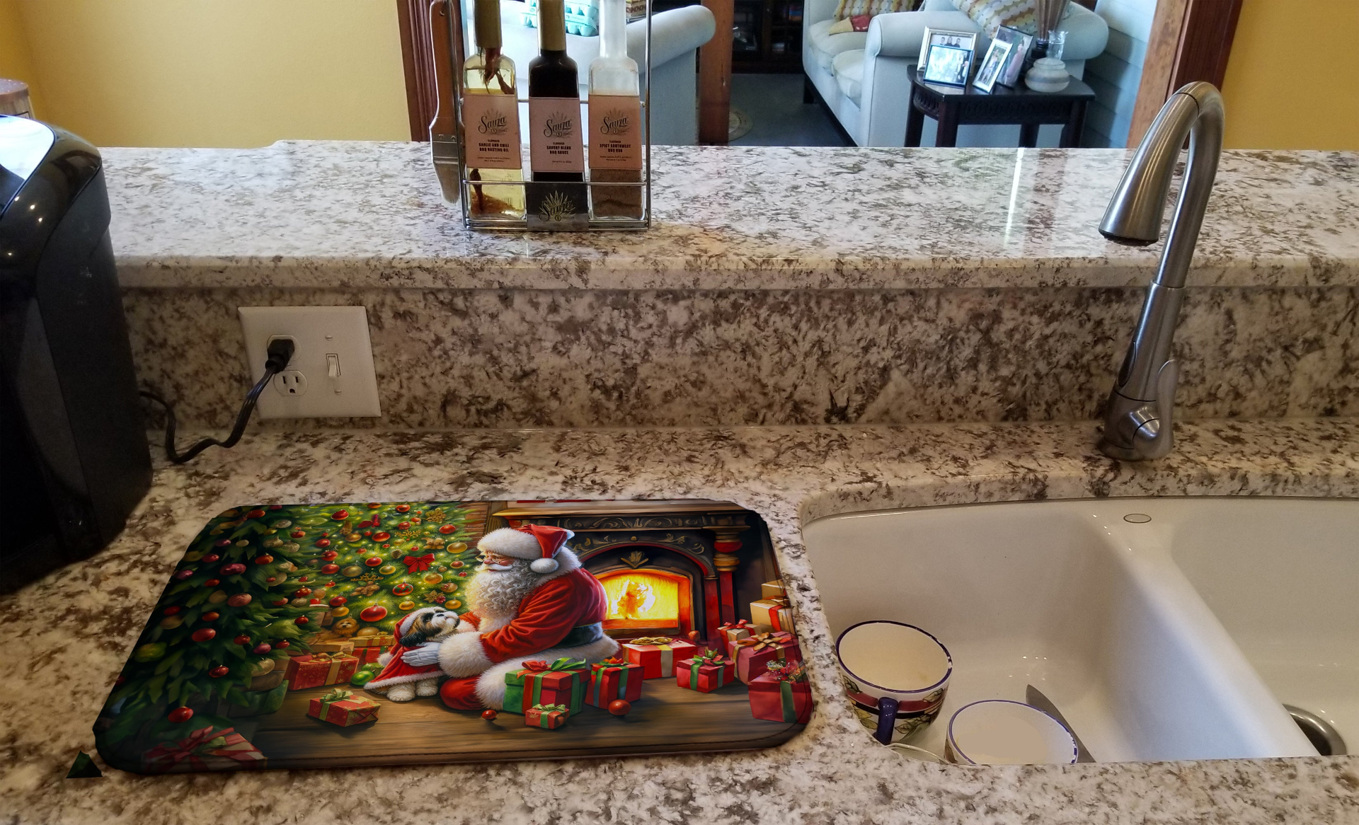 Dish Drying Mat featuring breed specific Shih Tzu artwork. Celebrate Christmas with this Christmas Dish Drying Mat. Say goodbye to messy countertops and soggy dish towels with our innovative dish drying mat. Our high-quality dish drying pad is designed to keep your countertops dry while offering a stylish and efficient solution. Whether you're air drying dishes, glasses, stemware, silverware, pots, pans, bottles, or even fruits and vegetables, our dish mat is the perfect choice. The 14 inches x 22 inches size fits most counters and dish drying racks, and the non-slip design ensures stability. Made with water-absorbent polyester and a polyurethane foam insert, our dish drying mat is not only functional but also durable. It's machine washable and printed in the USA for long-lasting use. The beautiful artwork adds flair to your kitchen decor, making it a perfect housewarming gift or present for any occasion. Upgrade your kitchen experience with our absorbent and versatile dish drying mat.