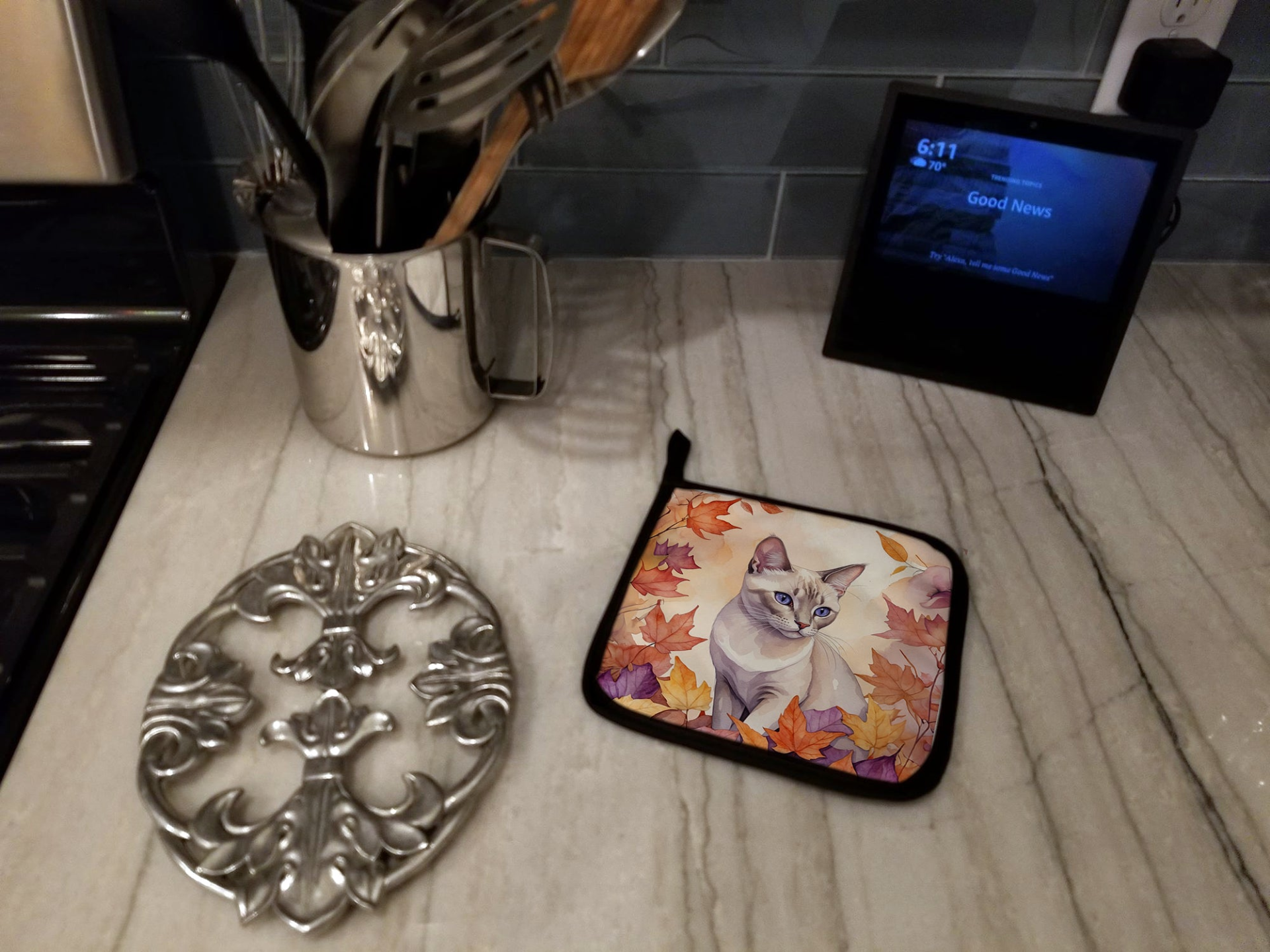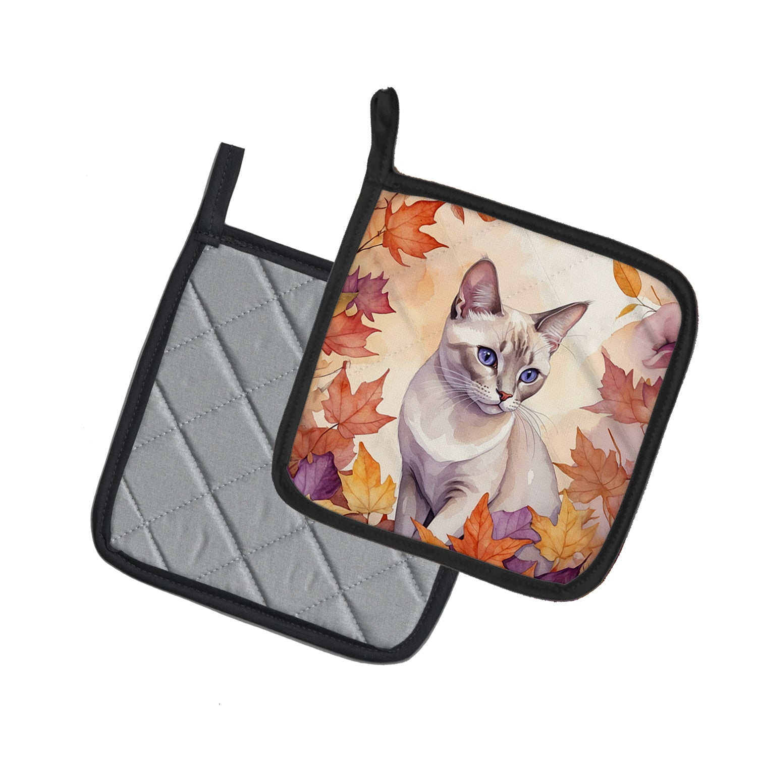 Pair of Pot Holders featuring breed specific Thai Lilac artwork. A Pair of Pot Holders to match your kitchen decor. Made in the USA these are thick and functional. Full color artwork decorates the front polyester fabric of the hot pad and accented by a black trim. Use these at as a trivet for your Thanksgiving or Christmas tablescape. Filled with insulated fabric and quilted for durability. These colorful pot holders will make a great gift for your favorite home cook or executive chef. Each pot holder measures approximately 7 1/2 inches by 7 1/2 inches. A hanging tab is included.