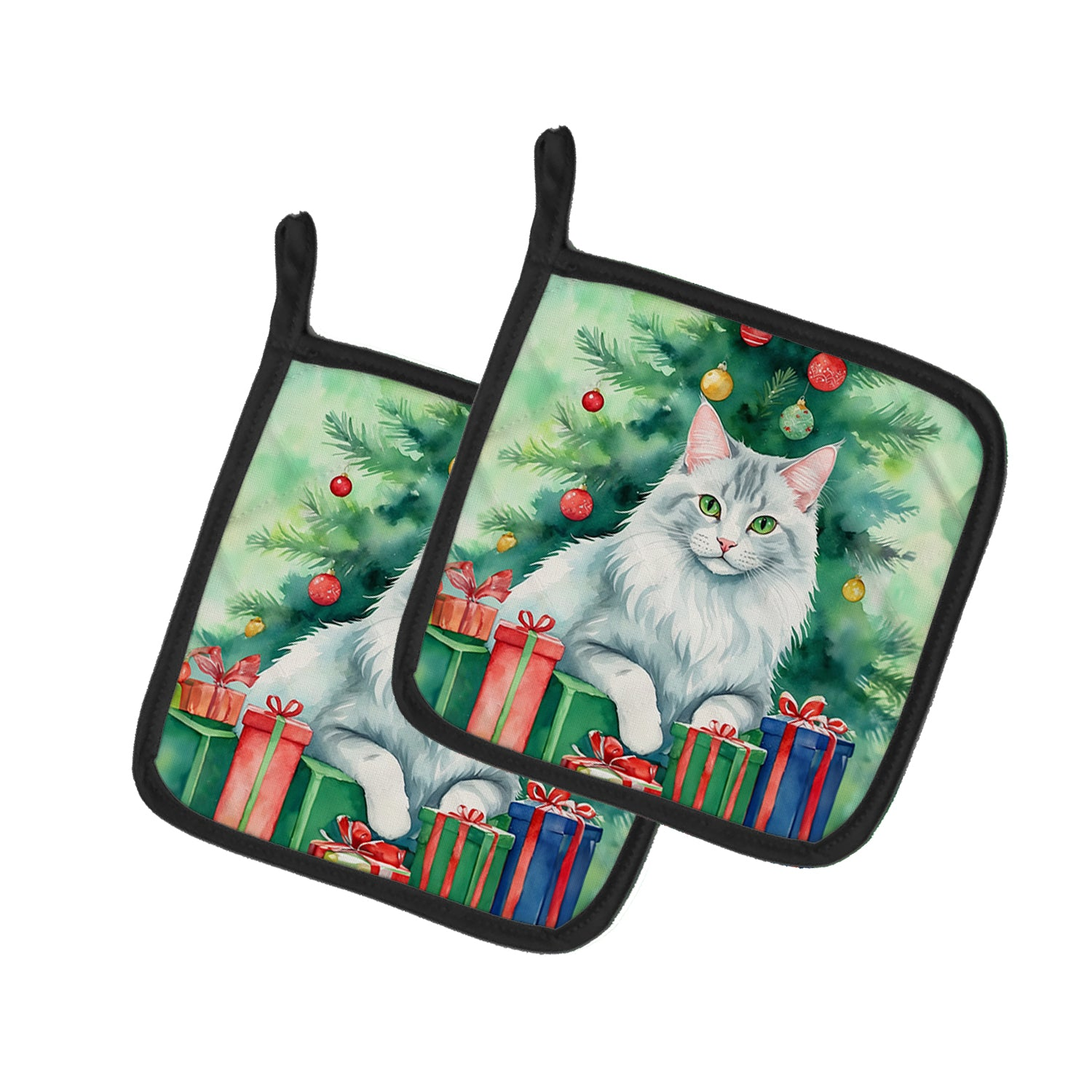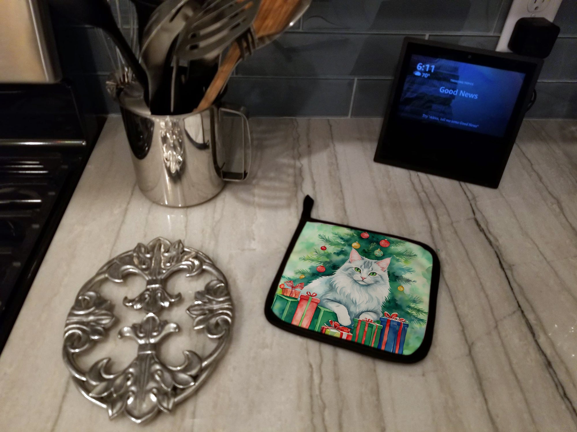 Pair of Pot Holders featuring breed specific Turkish Angora Cat artwork. Celebrate Christmas with this Christmas Pair of Pot Holders. A Pair of Pot Holders to match your kitchen decor. Made in the USA these are thick and functional. Full color artwork decorates the front polyester fabric of the hot pad and accented by a black trim. Use these at as a trivet for your Thanksgiving or Christmas tablescape. Filled with insulated fabric and quilted for durability. These colorful pot holders will make a great gift for your favorite home cook or executive chef. Each pot holder measures approximately 7 1/2 inches by 7 1/2 inches. A hanging tab is included.