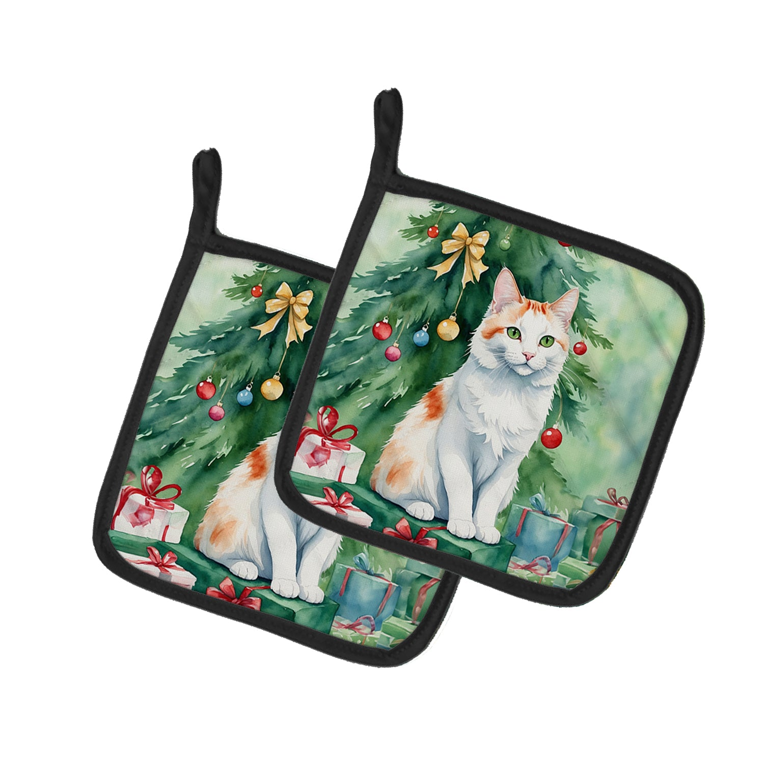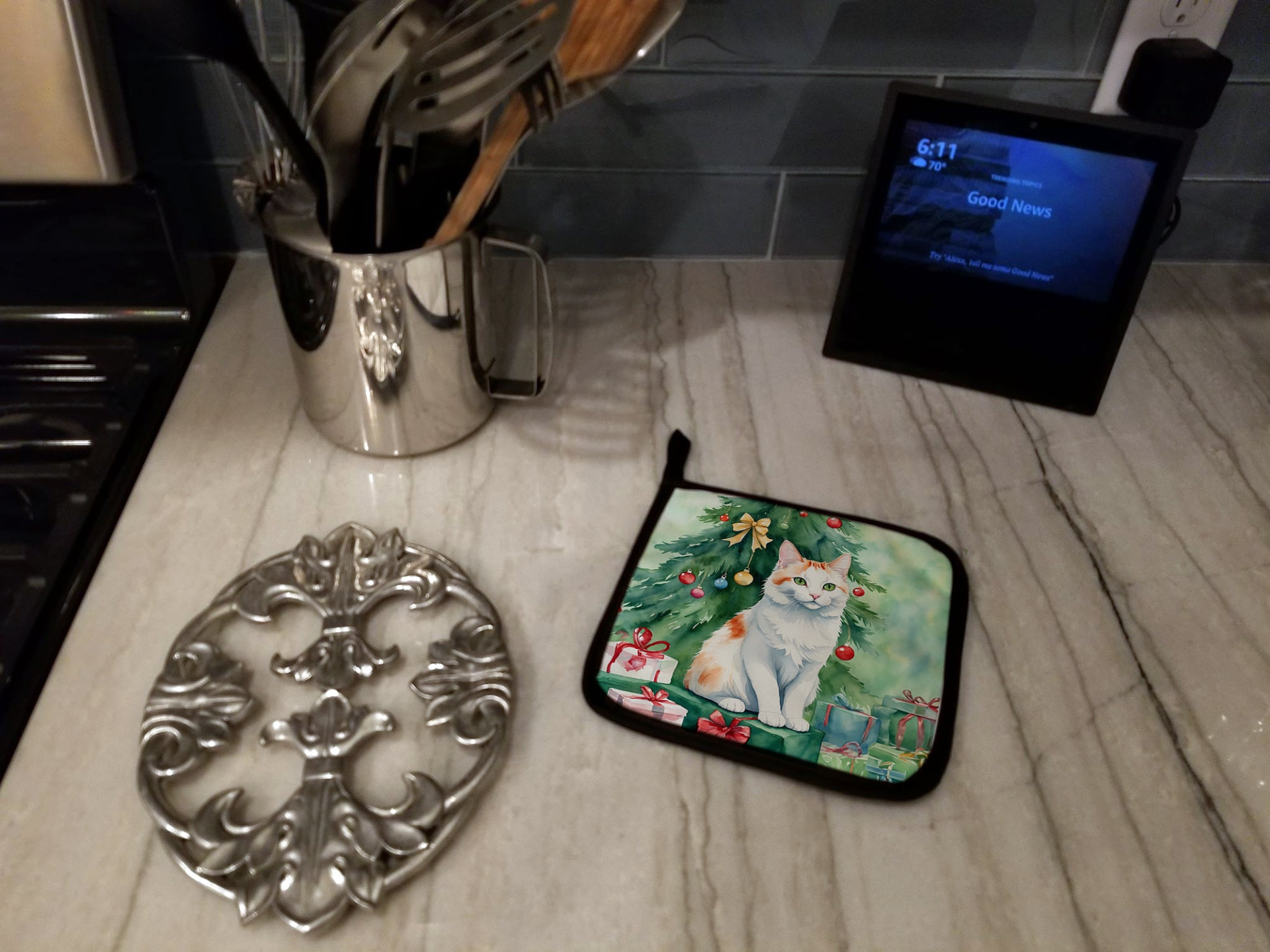 Pair of Pot Holders featuring breed specific Turkish Van artwork. Celebrate Christmas with this Christmas Pair of Pot Holders. A Pair of Pot Holders to match your kitchen decor. Made in the USA these are thick and functional. Full color artwork decorates the front polyester fabric of the hot pad and accented by a black trim. Use these at as a trivet for your Thanksgiving or Christmas tablescape. Filled with insulated fabric and quilted for durability. These colorful pot holders will make a great gift for your favorite home cook or executive chef. Each pot holder measures approximately 7 1/2 inches by 7 1/2 inches. A hanging tab is included.