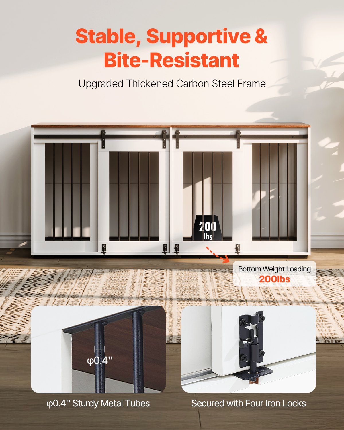 VEVOR 72" Dog Crate Furniture – White Double Dog Crate with Sliding Doors & TV Stand Top | Modern Wooden Dog Kennel with Removable Trays & Steel Frame for Small, Medium & Large Dogs