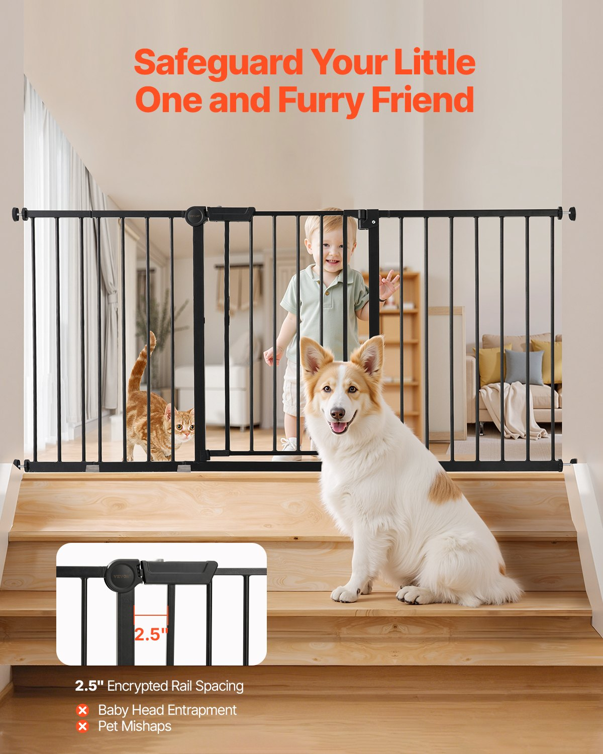 Built with reinforced steel construction and narrow bar spacing, it offers sturdy protection while maintaining an open, airy feel. The dual-locking system ensures childproof security, and the auto-close feature allows for hands-free convenience—ideal for busy households. With pressure-mount installation and included wall cups, setup is simple, secure, and damage-free.
