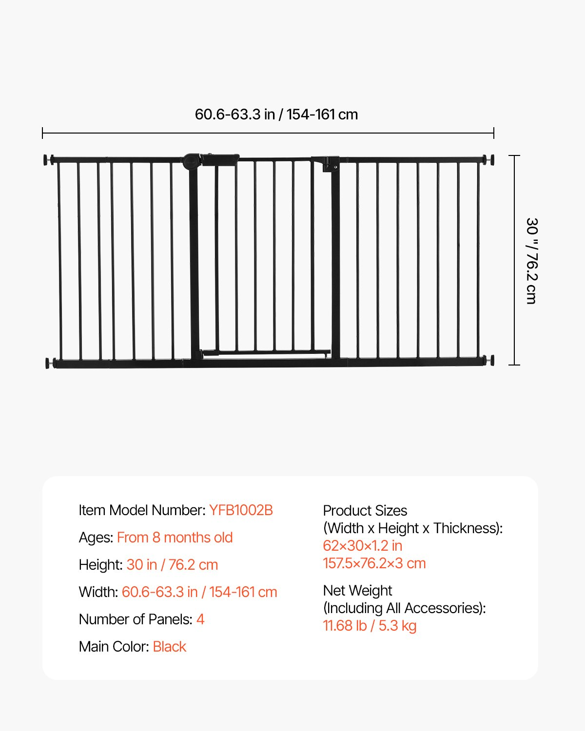 GuardianStep Extra-Wide Baby & Pet Safety Gate – 60.6"–63.3" Adjustable Pressure-Mounted Barrier (Black, 30" High)Create a secure and stylish environment for both children and pets with the GuardianStep Extra-Wide Baby & Pet Safety Gate. Designed to fit larger openings such as hallways, stairways, and double doors, this sleek black pressure-mounted gate offers the perfect blend of safety, convenience, and modern aesthetics. Its adjustable width of 60.6–63.3 inches provides excellent versatility, while the 30-inch height ensures safety without feeling obstructive.