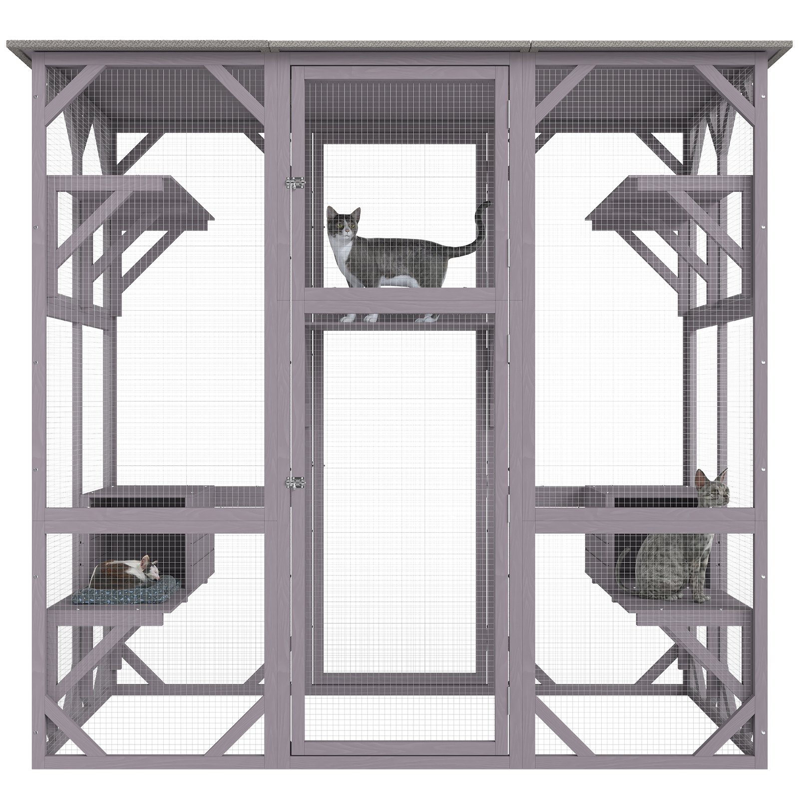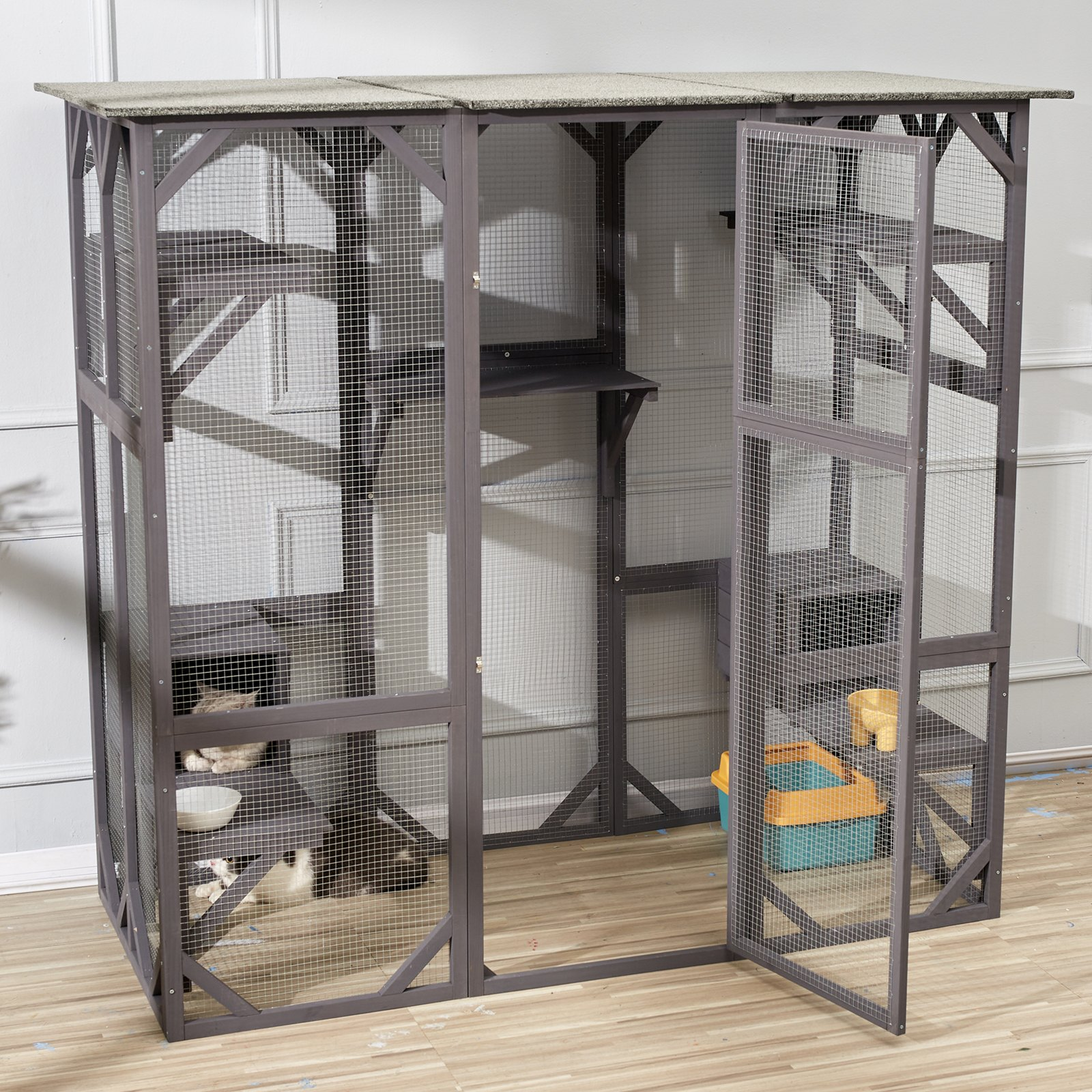 With five sturdy platforms, two cozy resting boxes, and a large front door for easy access, this enclosure offers endless opportunities for enrichment. Its weather-resistant materials make it perfect for porches, backyards, or indoor spaces, allowing your pets to safely enjoy the sights and sounds of nature.