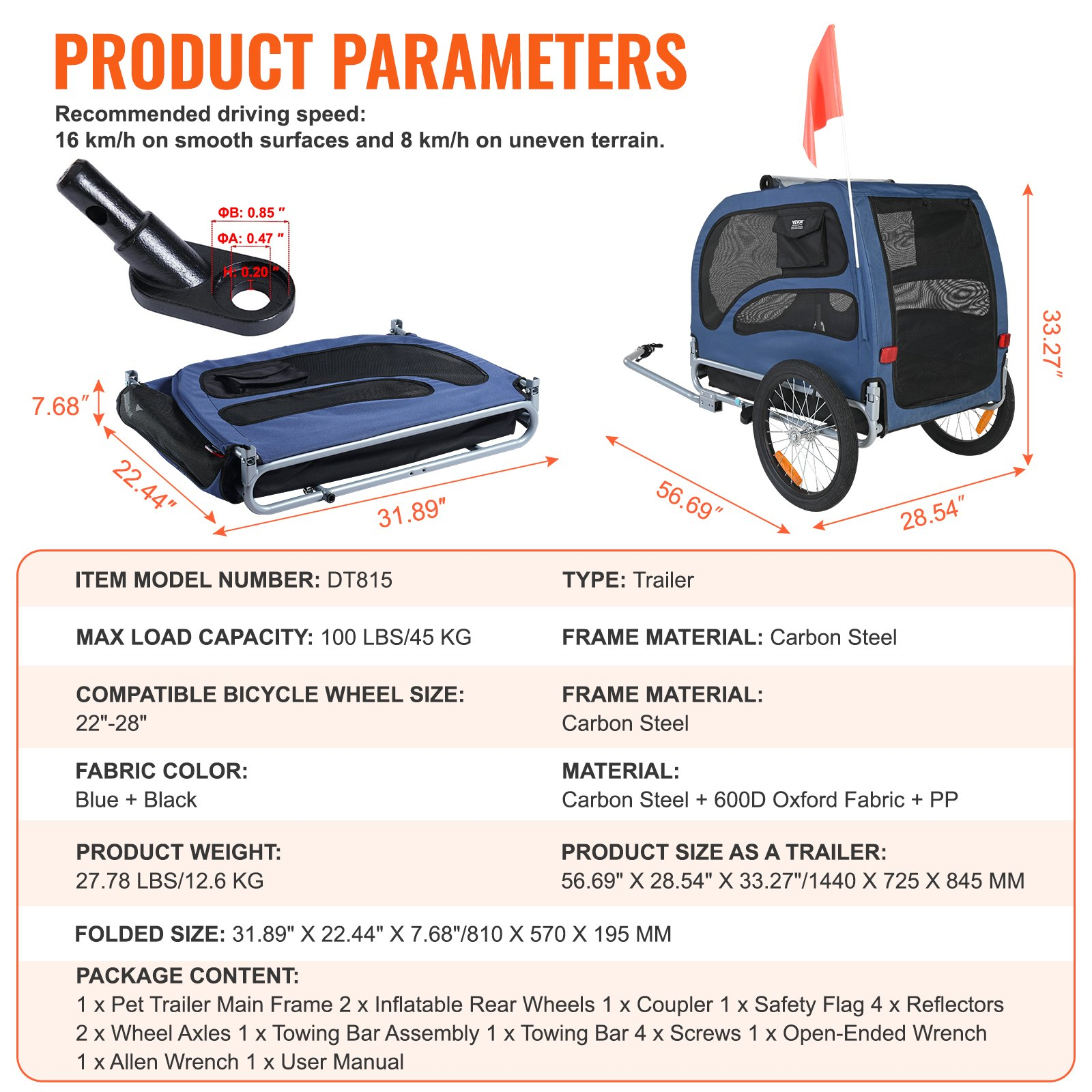 Type: Trailer,Pet Compartment Size: 31.9" x 22" x 24.4"/810 x 560 x 620 mm,Item Model Number: DT815,Product Weight: 27.78 lbs/12.6 kg,Folded Size: 31.89" x 22.44" x 7.68"/810 x 570 x 195 mm,Max Load Capacity: 100 lbs/45 kg,Frame Material: Carbon Steel,Material: Carbon Steel + 600D Oxford Fabric + PP,Compatible Bicycle Wheel Size: 22"-28",Fabric Color: Blue + Black,Product Size as a Trailer: 56.69" x 28.54" x 33.27"/1440 x 725 x 845 mm