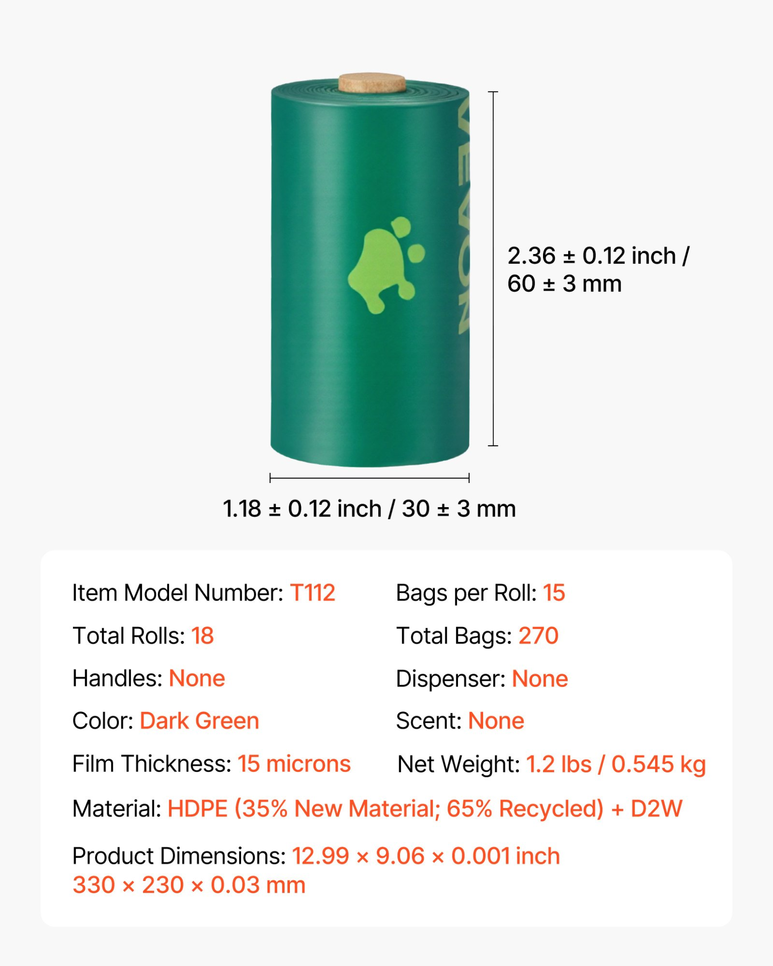 Keep your neighborhood clean and your conscience green with VEVOR Dog Poop Bags, the eco-conscious way to handle pet waste. This 270-count value pack includes 18 refill rolls, each containing 15 extra-thick biodegradable bags designed for durability, leak protection, and odor control. Made from HDPE material with D2W degradation technology, these bags break down faster than standard plastic, reducing your environmental pawprint while maintaining superior strength.
