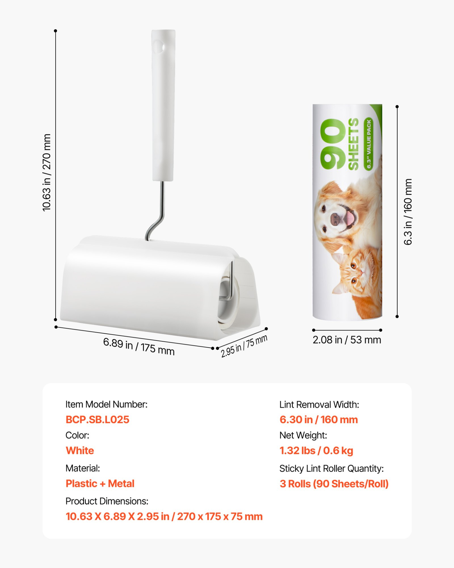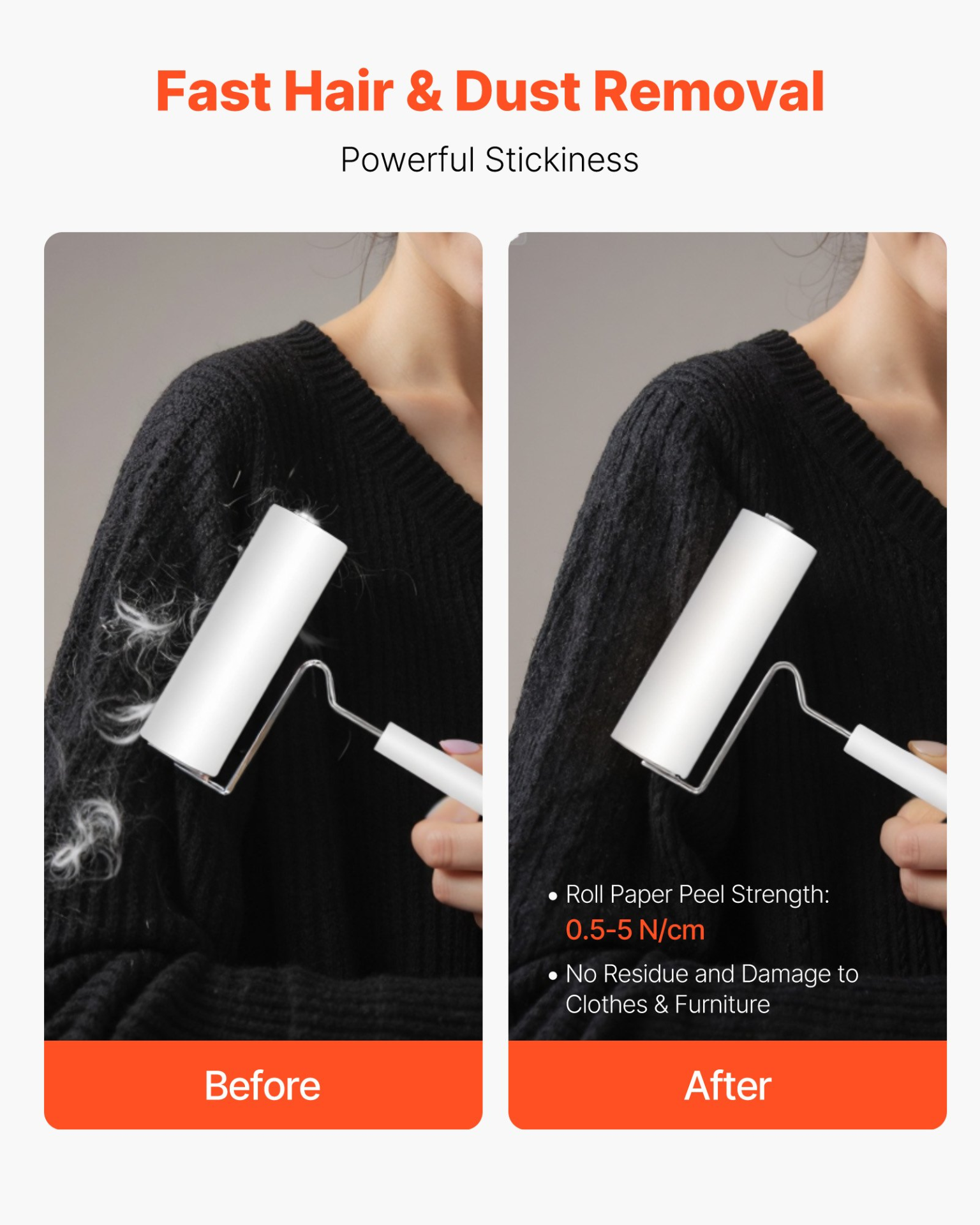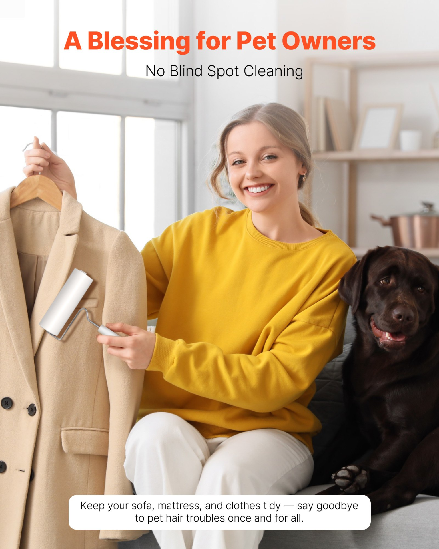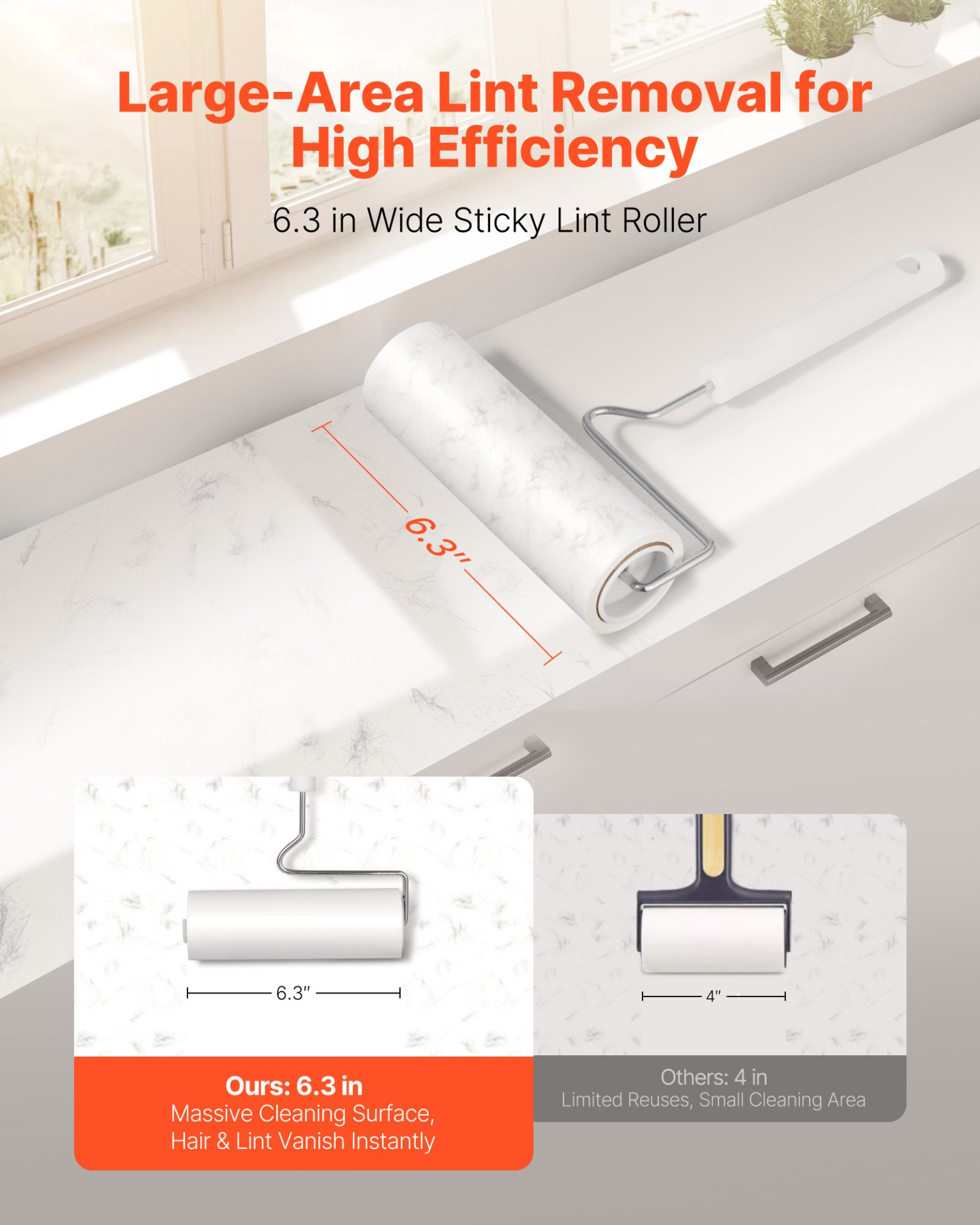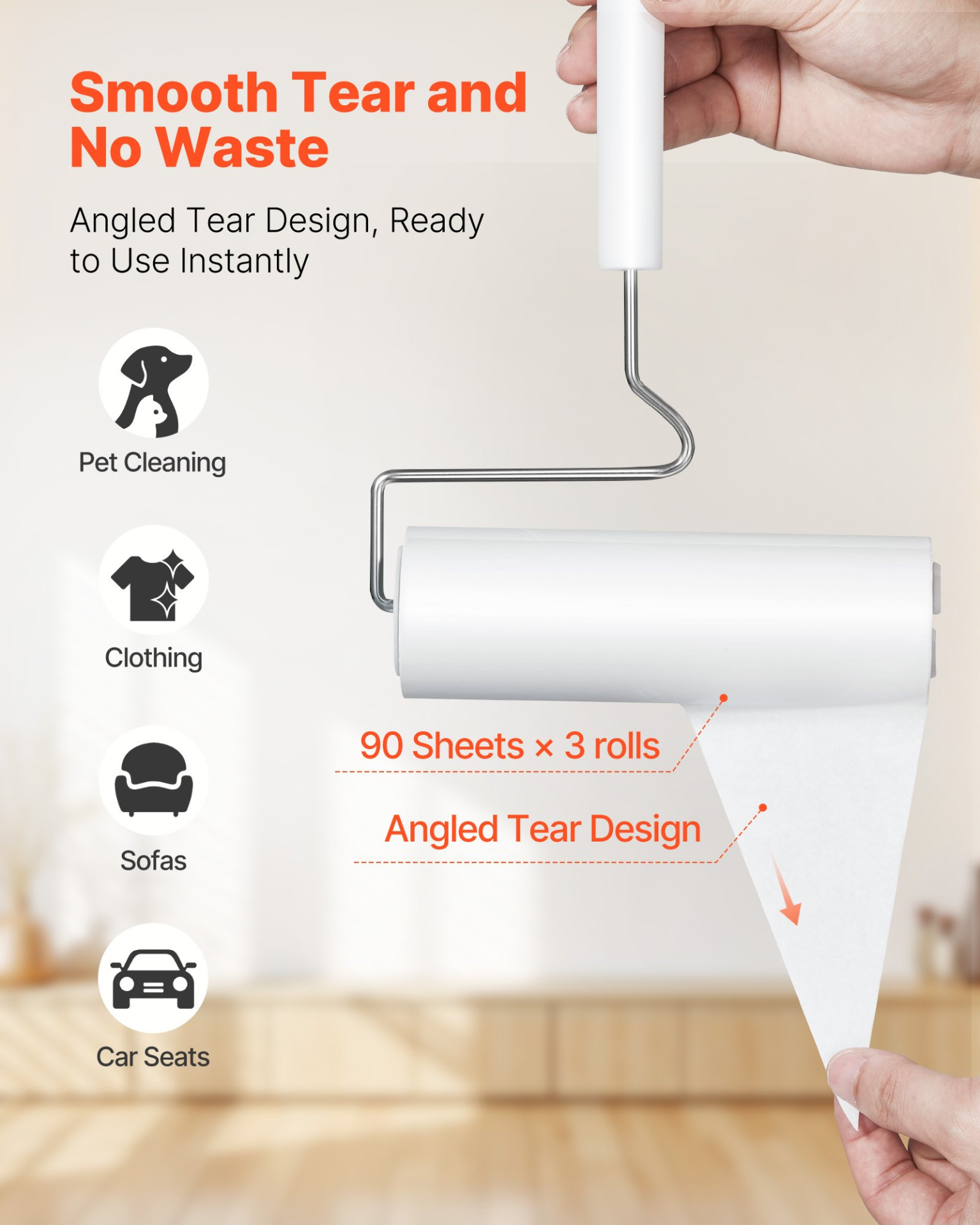 Say goodbye to stubborn pet hair, dust, and lint with the VEVOR Sticky Lint Roller Set, a 3-pack collection that combines convenience, efficiency, and durability. Each roller features 90 extra-sticky sheets—a total of 270 sheets—perfect for cleaning fur-covered furniture, clothes, car seats, and bedding. Designed with a smooth 360° rotating handle, it glides effortlessly in any direction for quick, snag-free cleaning.
