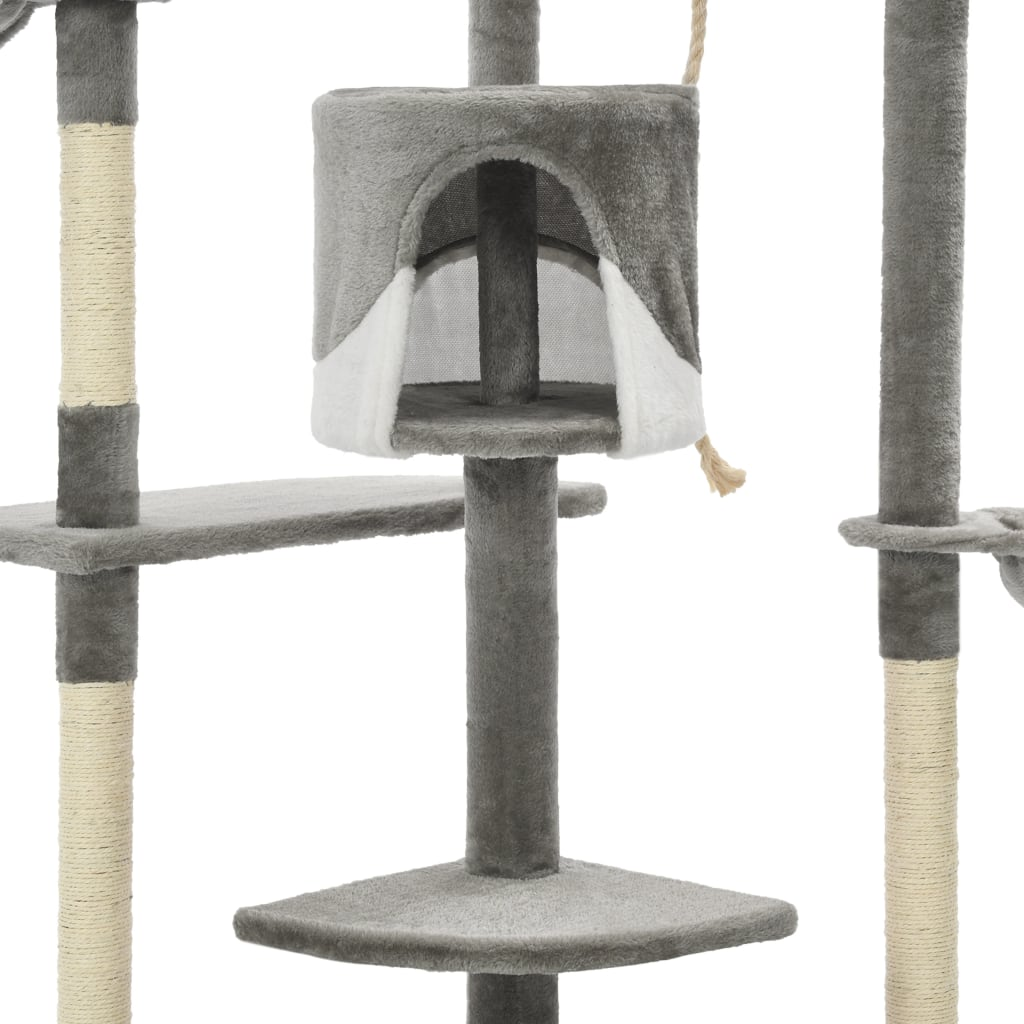 This large cat tree is a nifty playground made for kitty fun, featuring lots of levels and scratching posts that invite playful adventures and comfy lounging. Its sleek grey and white design adds a modern vibe to any living room, while giving your cat a cool place to chill, play, and scratch.