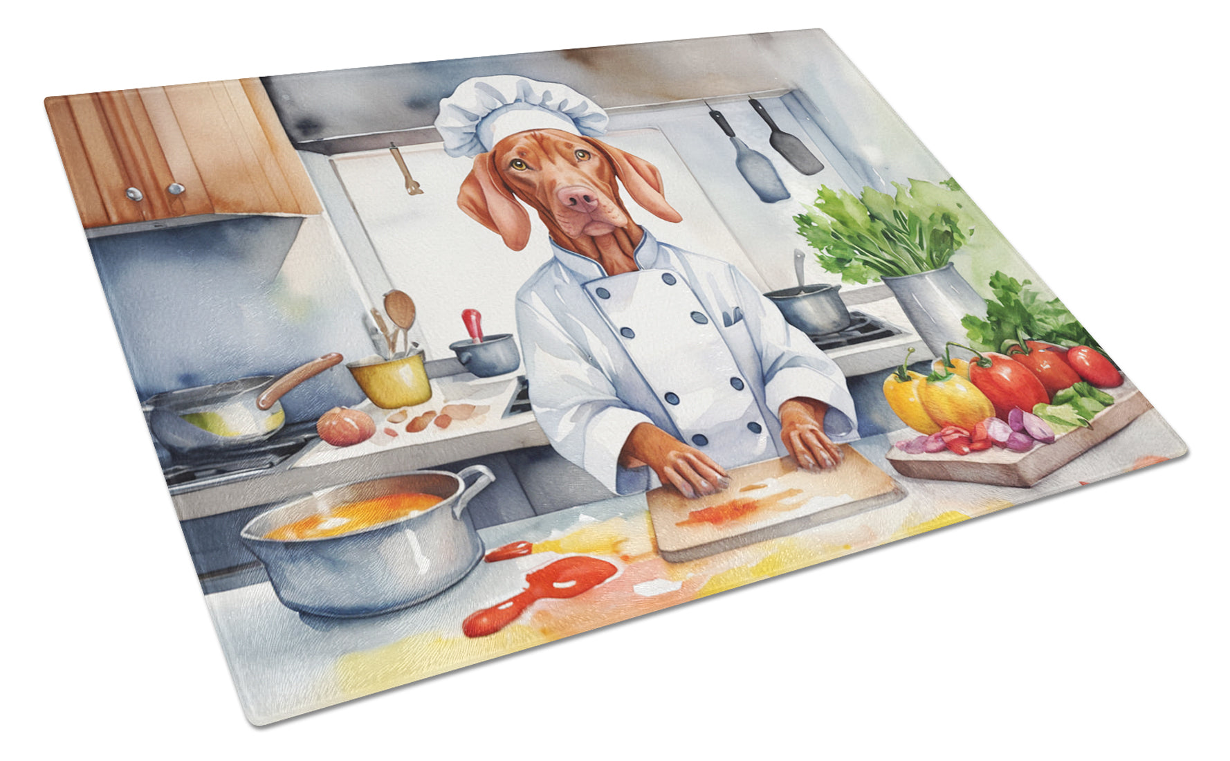Glass Cutting Board featuring breed specific Vizsla artwork. Introduce your kitchen to the vibrant, large Decorative Glass Cutting Board from Caroline's Treasures. Crafted from resilient tempered glass, this board is not only a utilitarian necessity but also a colorful art piece. With its generous dimensions of 15 inches in height and 12 inches in length, it offers ample space for all your cutting needs. Every piece showcases captivating artwork from distinguished artists, bringing an aesthetic edge to your kitchen. Beyond its attractive design, this cutting board ensures your countertop stays pristine and unscathed, owing to its heat-resistant properties. Engineered with user convenience in mind, it features non-skid feet for stability, and rounded corners for additional safety. Its robust construction renders it virtually unbreakable, guaranteeing longevity. The board comes with protective feet bumpers, maintaining its position during use. This product is recommended to be hand washed only. Proudly printed and assembled in the United States, this cutting board exemplifies superior craftsmanship. With Caroline's Treasures' Decorative Glass Cutting Board, you're investing in a blend of functionality and artistic flair.