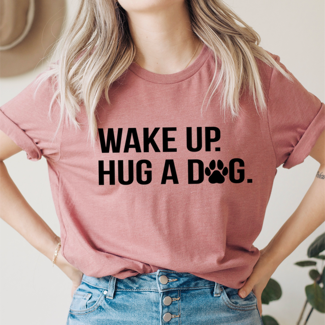"Experience the magic of this digitally printed tee, expertly crafted and printed in the USA. Made from 100% soft and ring-spun cotton, it offers a cozy and unique feel. Embrace the charm and enhance your style with this Wake Up Hug A Dog T-Shirt."