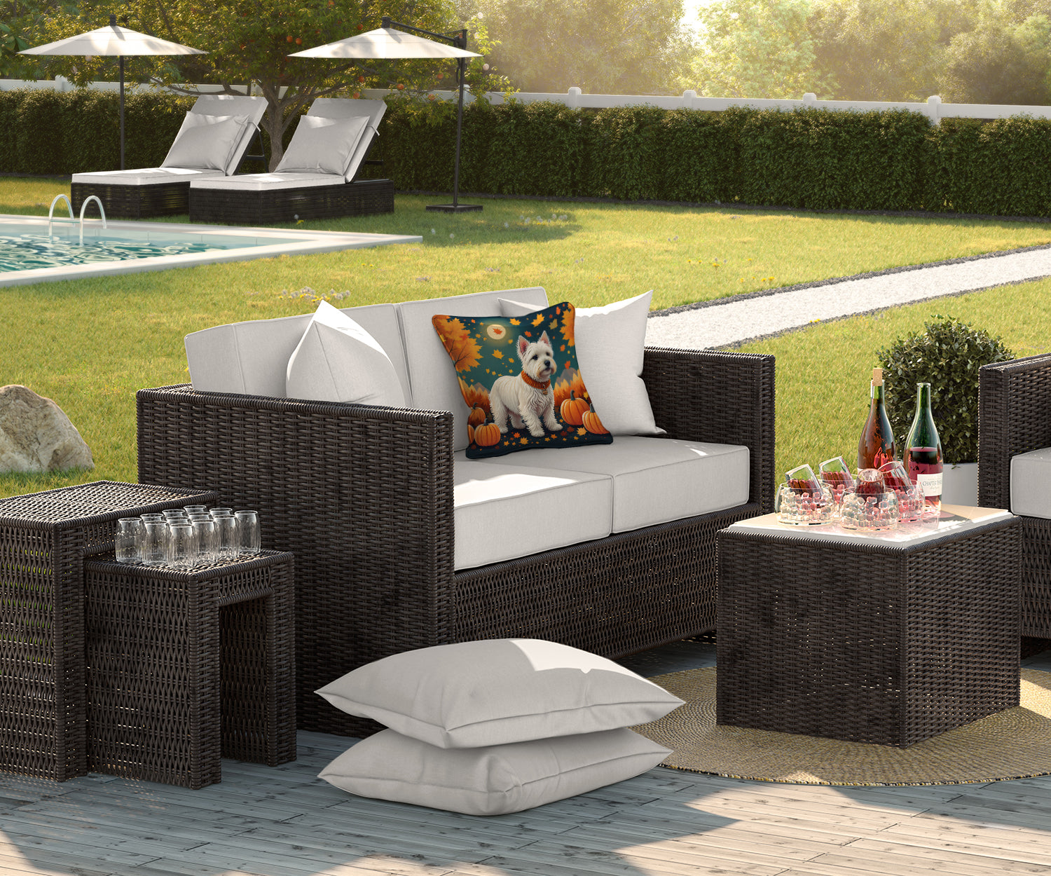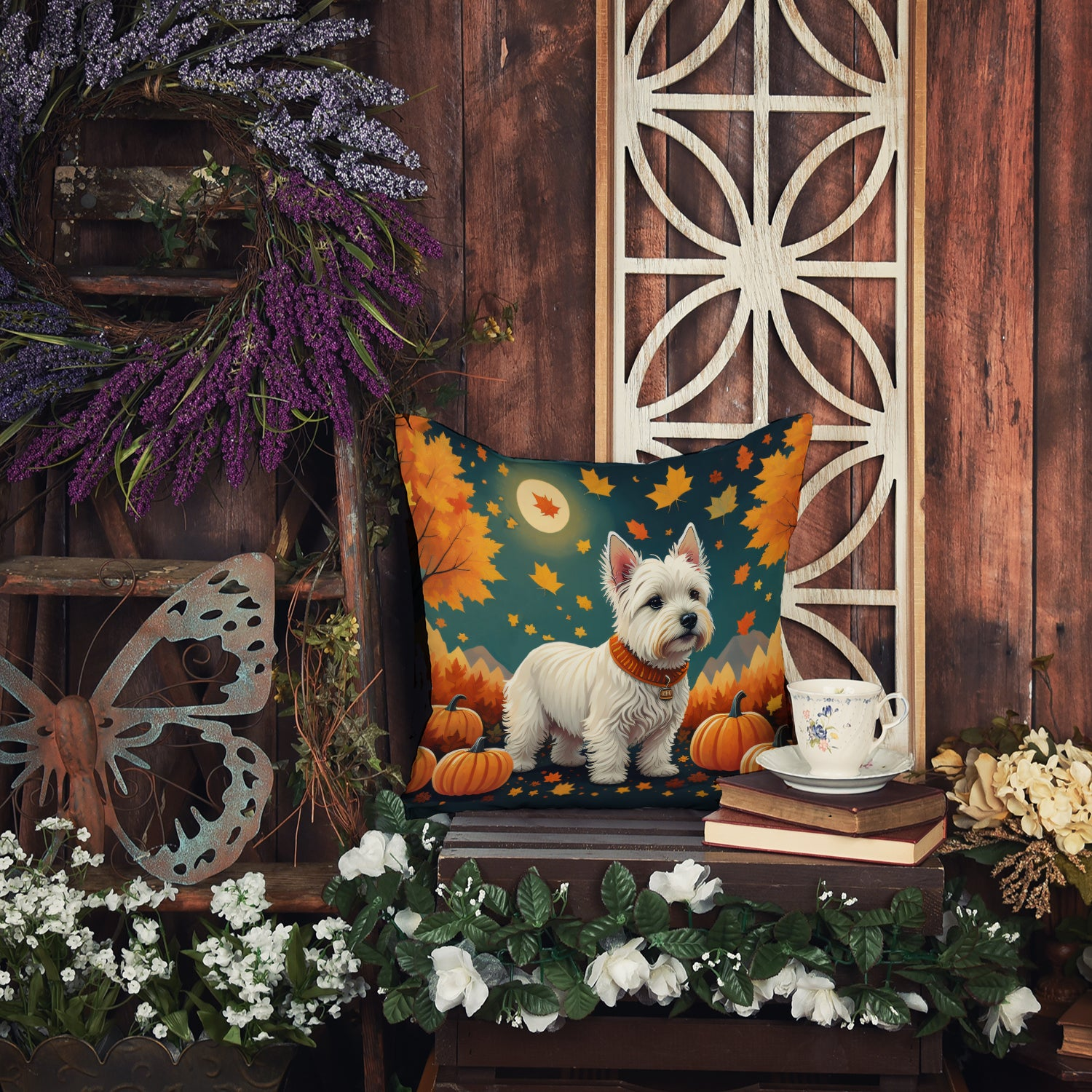 Throw Pillow featuring breed specific West Highland White Terrier artwork. Revitalize your outdoor or indoor living space with Caroline's Treasures 18x18 Fabric Decorative Pillow. With a generously sized dimension of approximately 18 inches by 18 inches, this pillow makes a comfortable and aesthetic addition to any seating area. Made from a unique, water-resistant material developed by Caroline's Treasures, the pillow sham is 100% polyester fabric that's durable and ready to weather any condition. Its vibrant, full-color artwork will not fade over time as it is dyed with color-fast dyes. Whether you place it on your patio furniture, porch, veranda, or indoor couch, its soft canvas fabric ensures a cozy experience. The pillow is handcrafted in the United States, featuring a sham created from three pieces of fabric and a polyester insert for enduring shape and overstuffed comfort. Despite being robustly built to endure the outdoors, it is as soft and snug as your favorite indoor cushions. Please note, as all our pillows are handmade, sizes may vary slightly, adding to the charm of this unique decorative item.