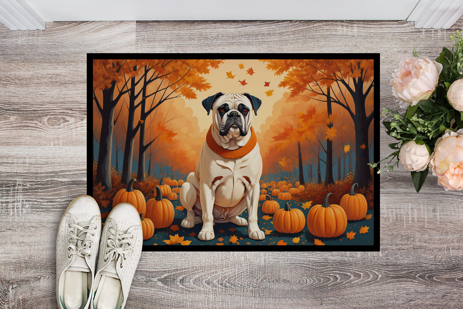 Doormat featuring breed specific Boxer artwork. Welcome your guests in style with our Artwork Door Mat, designed to withstand almost any weather condition. This mat, measuring approximately 18 by 27 inches, is held together by durable black binding tape. Its top layer, composed of polyester felt, is dyed with the eye-catching image you see on the mat. A few layers below provide the mat with stability, while its rubber bottom is stamped to help prevent slipping and ensures safety. Our mat works wonderfully as both an indoor or outdoor door mat. For cleaning, simply hose it off with water or use a power washer - no need for any cleaner that produces suds. Avoid scrubbing with a brush, instead, opt for the vacuum on floor setting. Designed manufactured and printed in the USA, this mat is a perfect addition to your porch, outdoor kitchen, entryway, or any indoor space. Its unique design makes it a charming decorative rug that greets your guests and adds a stylish touch to your home decor.