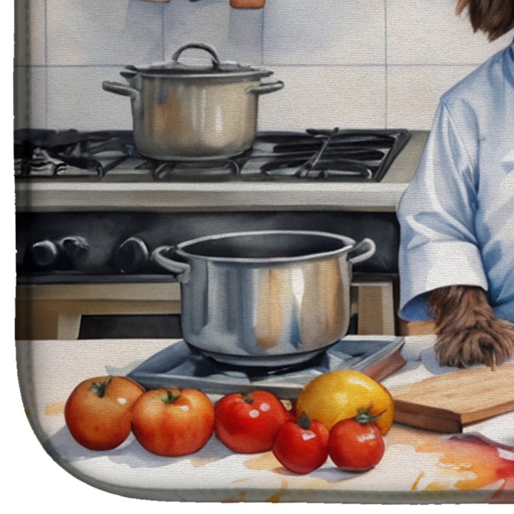 Dish Drying Mat featuring breed specific Wirehaired Pointing Griffon artwork. Say goodbye to messy countertops and soggy dish towels with our innovative dish drying mat. Our high-quality dish drying pad is designed to keep your countertops dry while offering a stylish and efficient solution. Whether you're air drying dishes, glasses, stemware, silverware, pots, pans, bottles, or even fruits and vegetables, our dish mat is the perfect choice. The 14 inches x 22 inches size fits most counters and dish drying racks, and the non-slip design ensures stability. Made with water-absorbent polyester and a polyurethane foam insert, our dish drying mat is not only functional but also durable. It's machine washable and printed in the USA for long-lasting use. The beautiful artwork adds flair to your kitchen decor, making it a perfect housewarming gift or present for any occasion. Upgrade your kitchen experience with our absorbent and versatile dish drying mat.